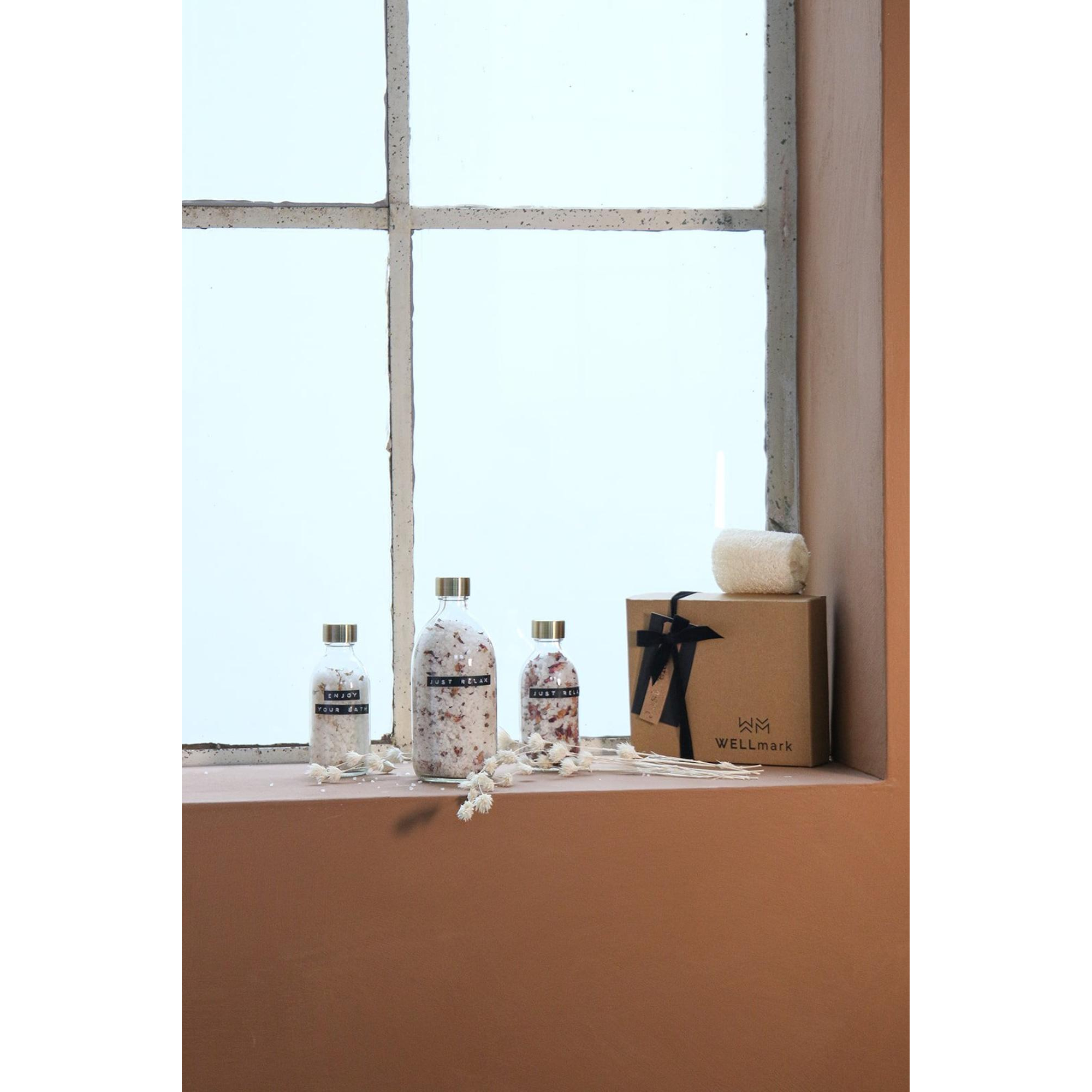 Wellmark Giftbox Badzout 3-delig - Helder Glas - Messing Dop - JUST RELAX