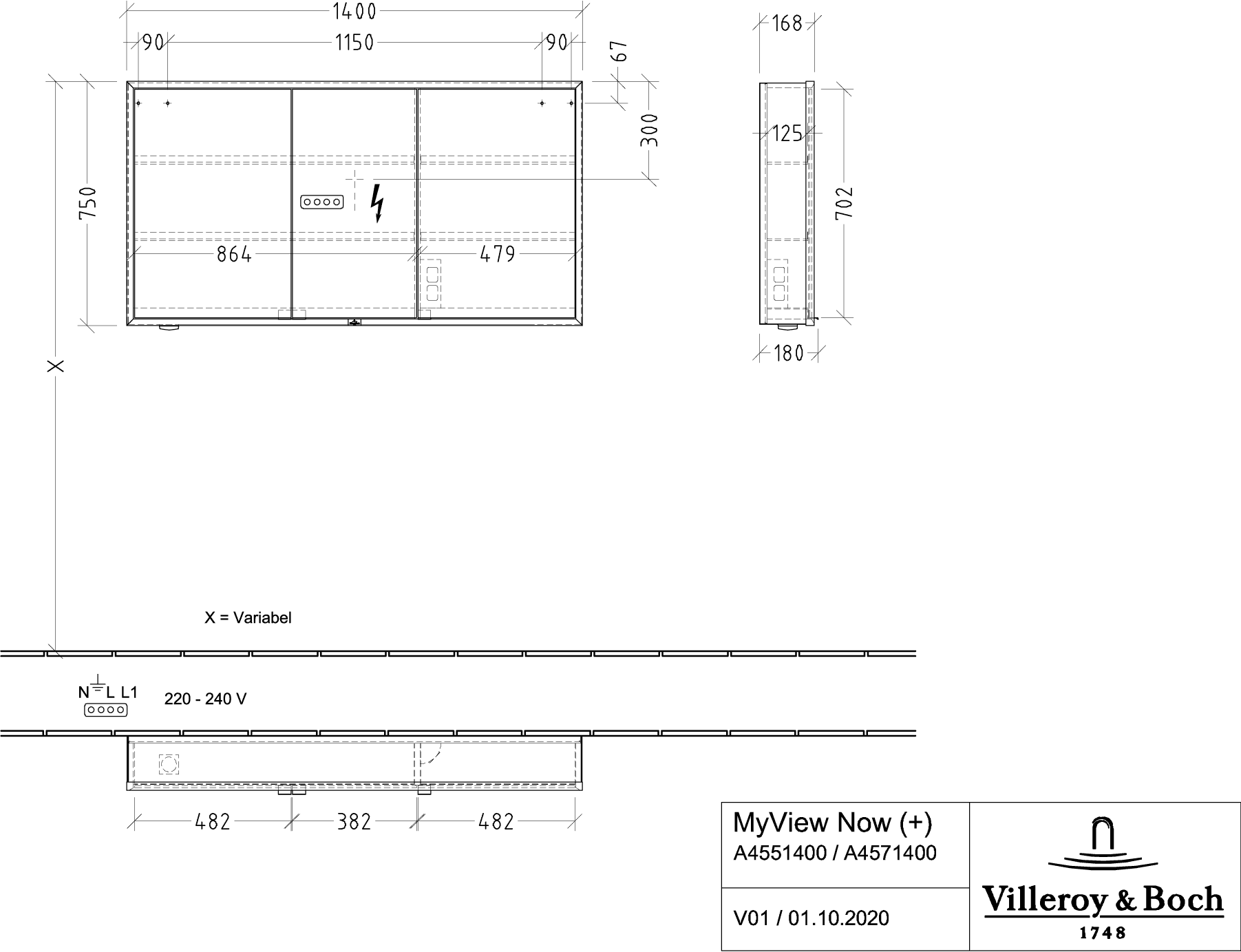 Villeroy & Boch My View Now spiegelkast m. 3 deuren m. led verlichting en wastafelverlichting 140x75x16.8cm m. in/uit schakelaar