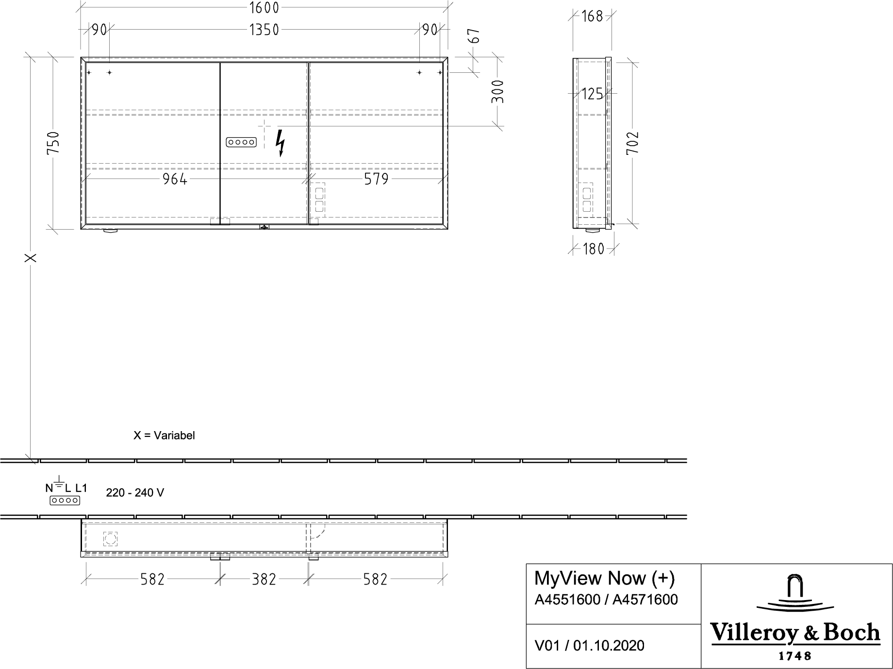 Villeroy & Boch My View Now spiegelkast m. 3 deuren m. led verlichting en wastafelverlichting 160x75x16.8cm m. sensorschakelaar