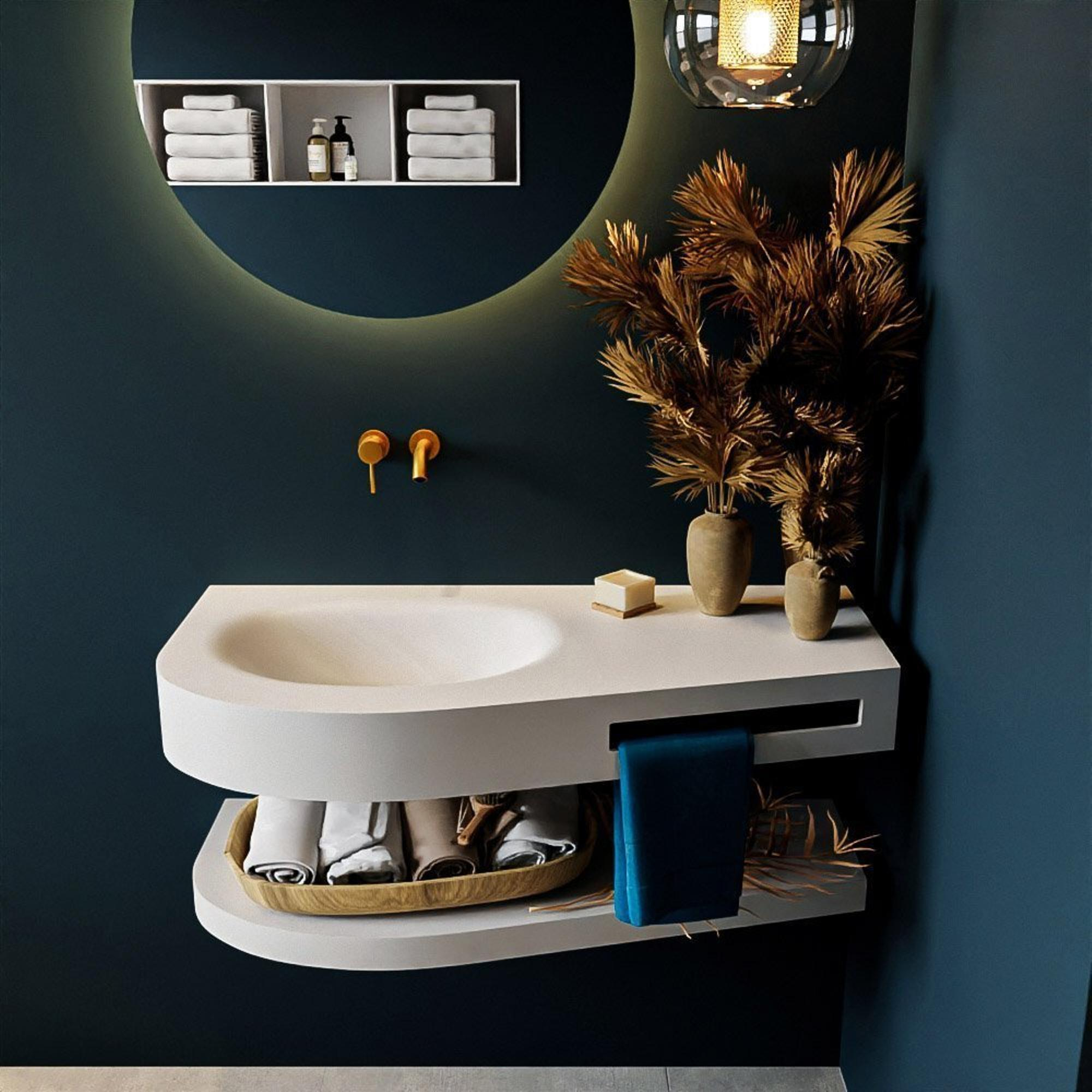 Gemaakt van hoogwaardig solid surface talc materiaal, is de MONDIAZ RIVA Badkamermeubelset niet alleen mooi, maar ook duurzaam. Dit materiaal is bestand tegen vocht, vlekken en krassen, waardoor het meubel lang meegaat en gemakkelijk te reinigen is. Investeer in kwaliteit en geniet jarenlang van een prachtig en functioneel badkamermeubel.