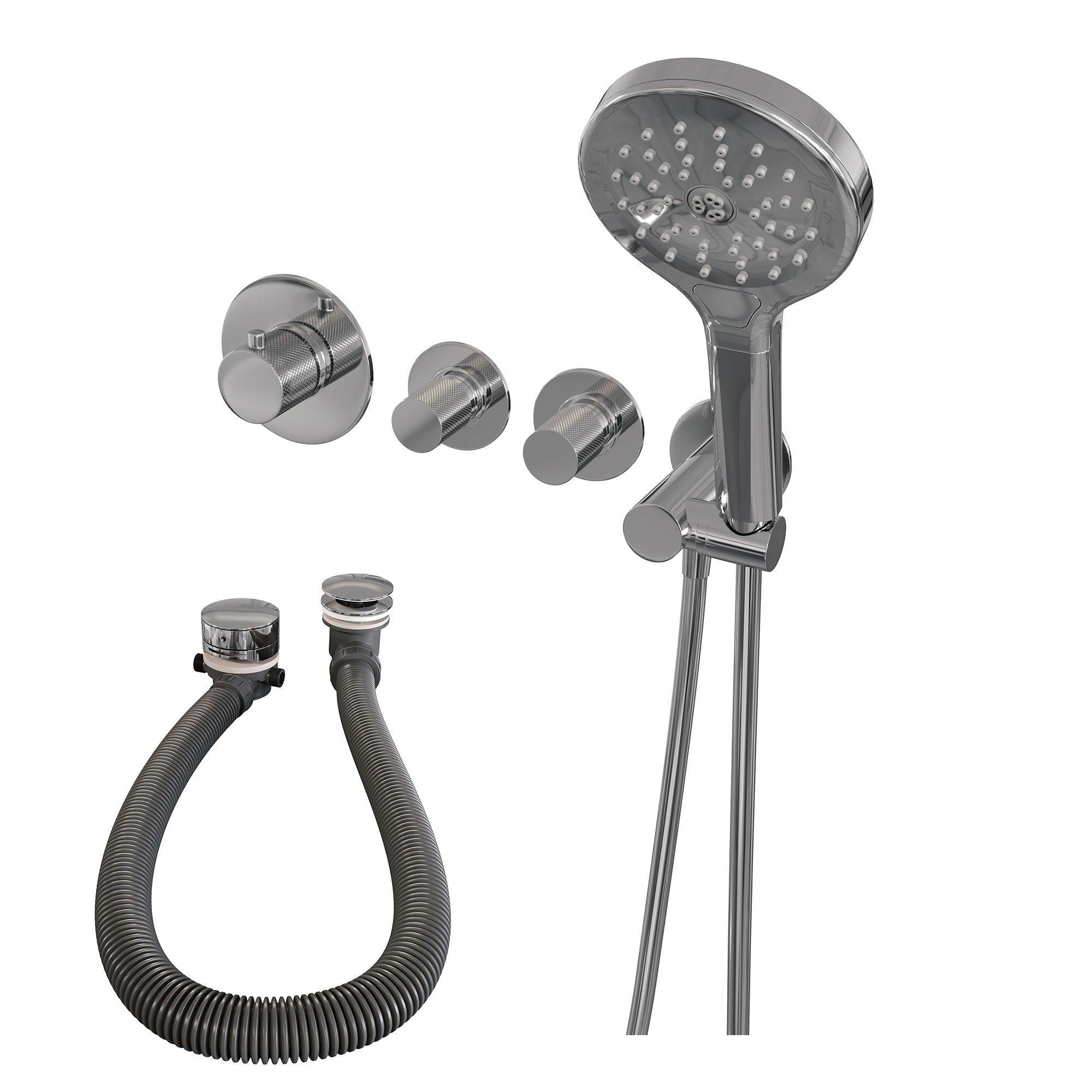 Dit douchegarnituur is niet alleen stijlvol, maar ook zeer functioneel. De inbouwinstallatie zorgt voor een opgeruimde uitstraling in je badkamer en bespaart ruimte. De handdouche met 3 standen biedt verschillende sproeipatronen, waardoor je kunt kiezen voor een zachte, massage-achtige straal of een krachtige regendouche. De carving knoppen maken het eenvoudig om de watertemperatuur en -druk aan te passen naar jouw voorkeur.