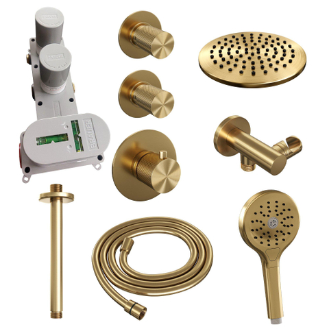 Brauer Gold Carving Regendoucheset inbouw - hoofddouche 20cm - plafondarm 20cm - 3 carving knoppen - handdouche rond 3 standen - PVD - geborsteld goud