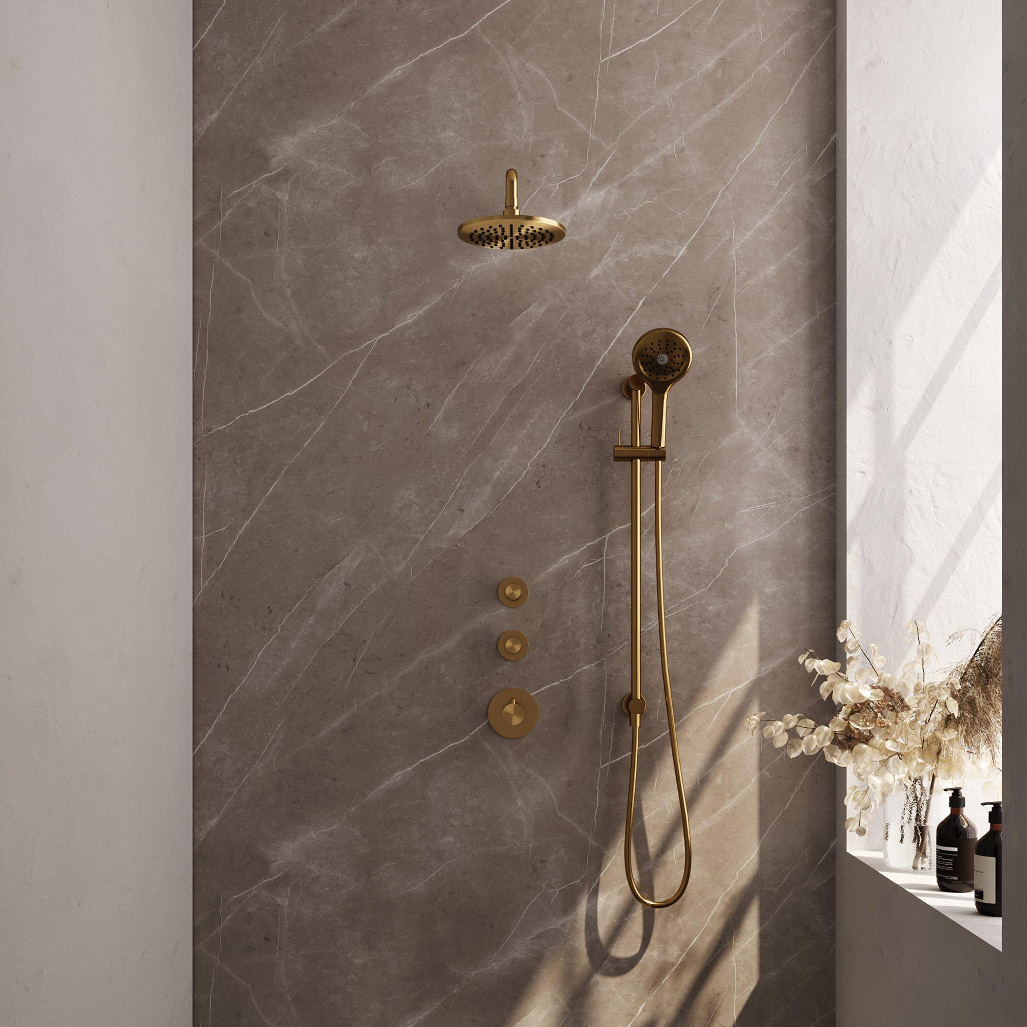 De Brauer Gold Carving Regendoucheset inbouw is ontworpen met oog voor detail en stijl. De geborsteld gouden afwerking geeft een luxe uitstraling aan de badkamer. De ronde hoofddouche van 20cm zorgt voor een gelijkmatige waterverdeling en een verfrissende douche-ervaring. De glijstang en wandarm bieden flexibiliteit en gemak bij het instellen van de ideale douchepositie.