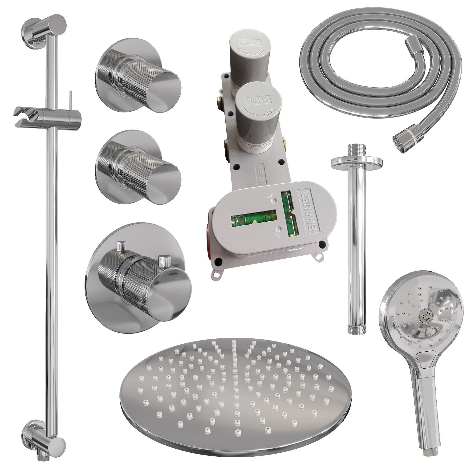 Brauer Chrome Carving Regendoucheset inbouw - hoofddouche 30cm - plafondarm 20cm - 3 carving knoppen - handdouche rond 3 standen - chroom