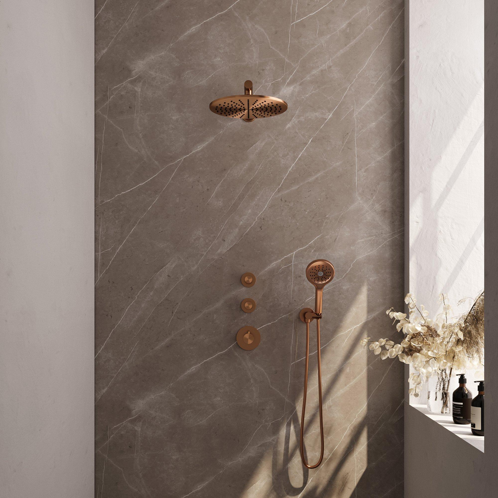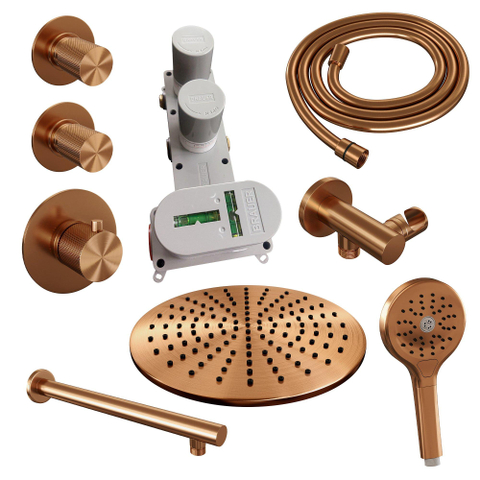 Brauer Copper Carving Regendoucheset inbouw - hoofddouche 30cm - 3 carving knoppen - rechte wandarm - handdouche rond 3 standen - PVD - geborsteld koper