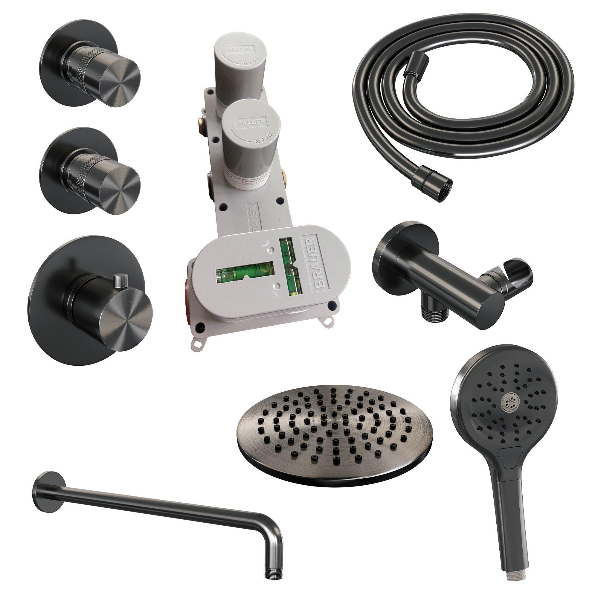 Brauer Gunmetal Edition Regendoucheset inbouw - hoofddouche 20cm - Wandarm - met inbouwdeel - Gladde knoppen - handdouche Rond 1 stand - PVD - geborsteld gunmetal