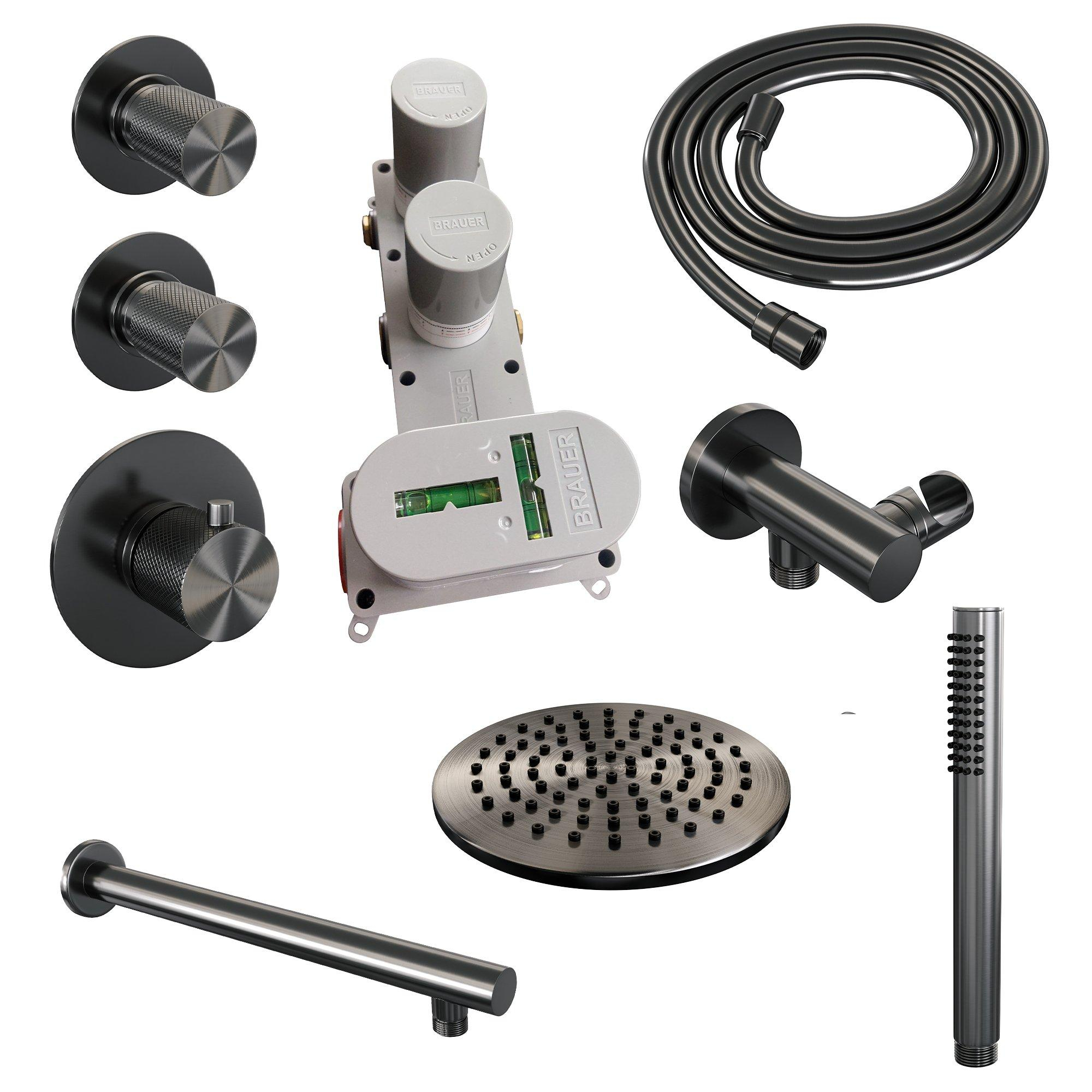 Brauer Gunmetal Carving Regendoucheset inbouw - hoofddouche 20cm - 3 carving knoppen - rechte wandarm - handdouche staaf 1 stand - PVD - geborsteld gunmetal