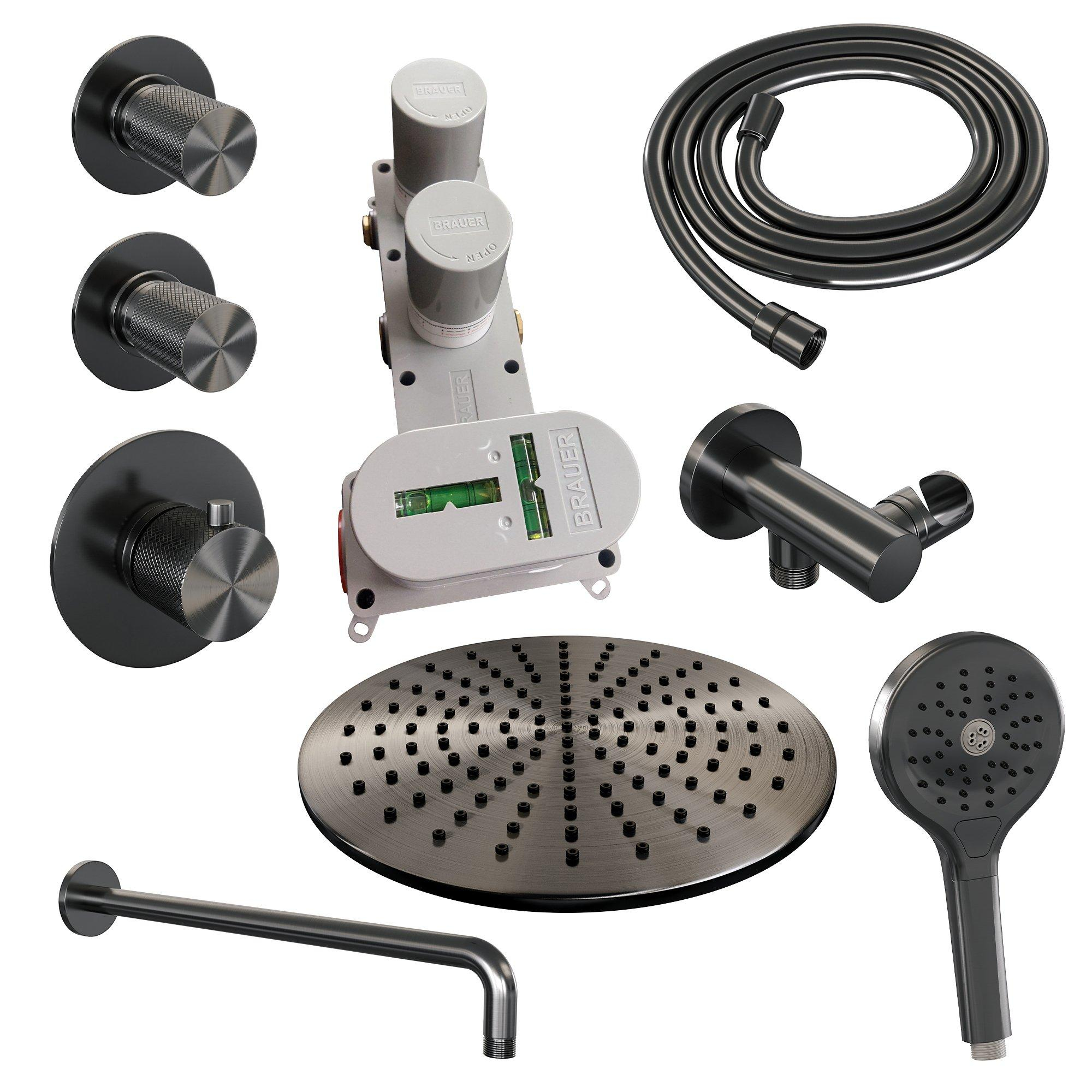 Brauer Gunmetal Carving Regendoucheset inbouw - hoofddouche 30cm - Wandarm - met inbouwdeel - Carving knoppen - handdouche Rond 1 stand - PVD - geborsteld gunmetal