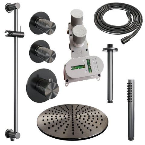 Brauer Gunmetal Carving Regendoucheset inbouw - hoofddouche 30cm - plafondarm 20cm - 3 carving knoppen - handdouche staaf 1 stand - - PVD - geborsteld gunmetal