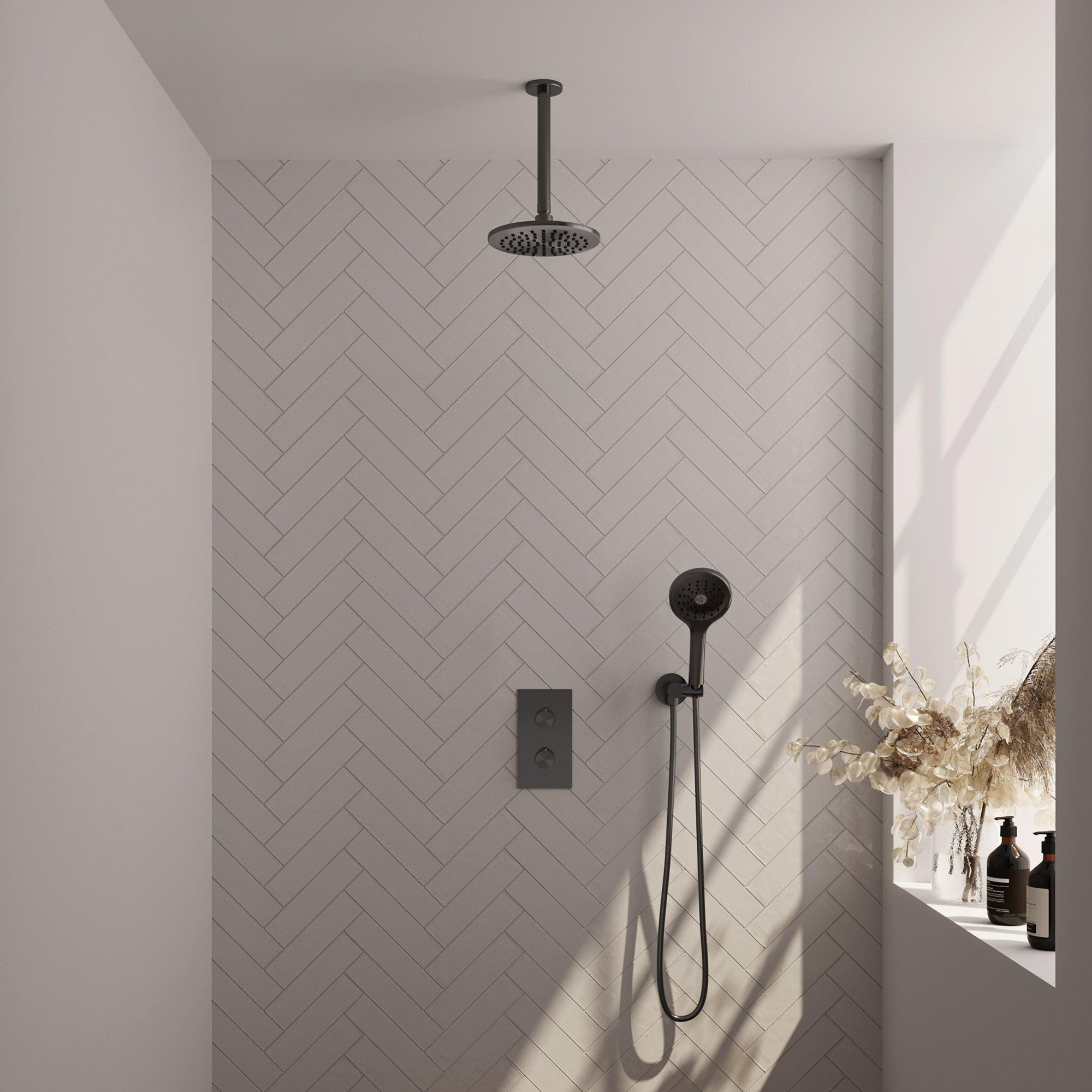 Diameter hoofddouche: 20 cm -20cm Plafondarm - met glijstang: 1 - 1 stand(en) Staaf handdouche - Gunmetal Geborsteld (Antraciet) - Carving knop (€ 1.336,10 )