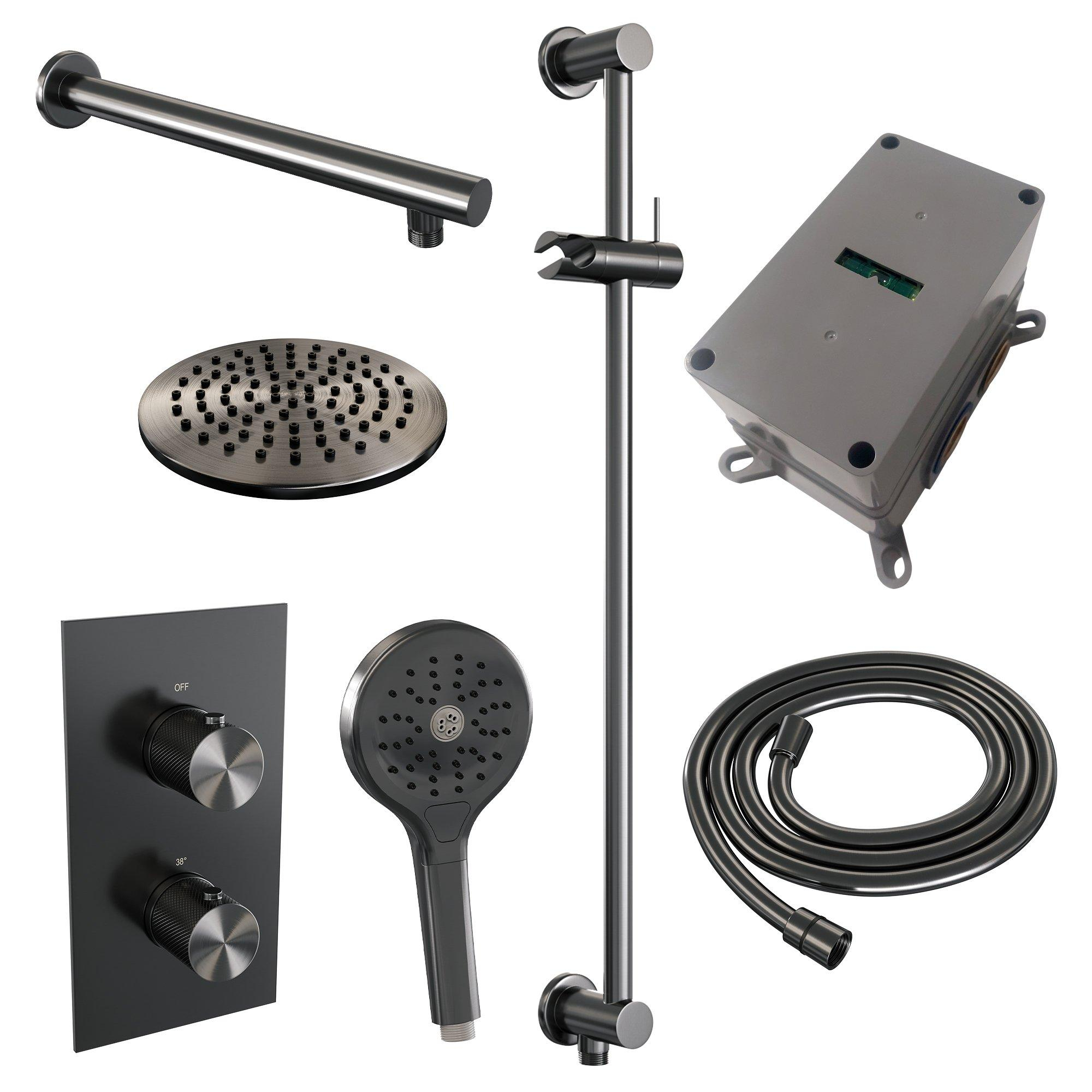 Brauer Gunmetal Carving Regendoucheset inbouw - hoofddouche 20cm - carving knop - handdouche Rond 3 standen - glijstang - PVD - geborsteld gunmetal SW715997