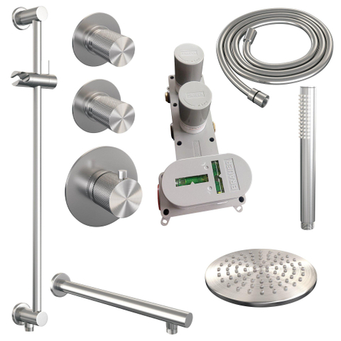 Brauer Brushed Carving Regendoucheset inbouw - hoofddouche 20cm - 3 carving knoppen - rechte wandarm - glijstang - handdouche staaf 1 stand - PVD - geborsteld RVS