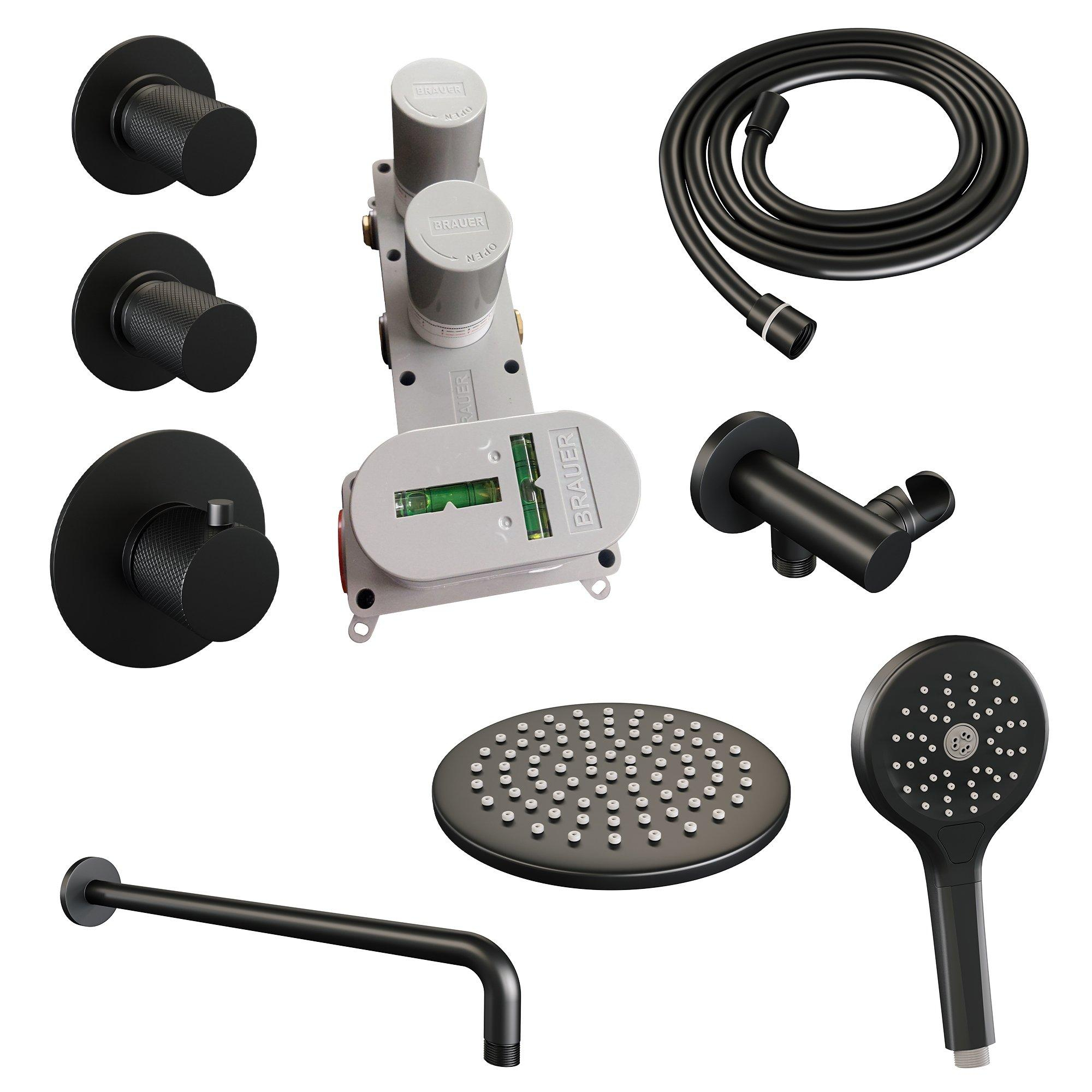 Brauer Black Carving Regendoucheset inbouw - hoofddouche 20cm - Wandarm - met inbouwdeel - 3 Carving knoppen - handdouche Rond 1 stand - mat zwart