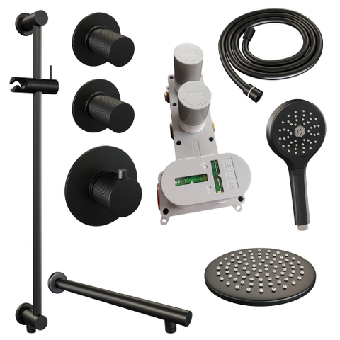 Brauer Black Carving Regendoucheset inbouw - hoofddouche 20cm - 3 carving knoppen - rechte wandarm - glijstang - handdouche Rond 3 standen - mat zwart