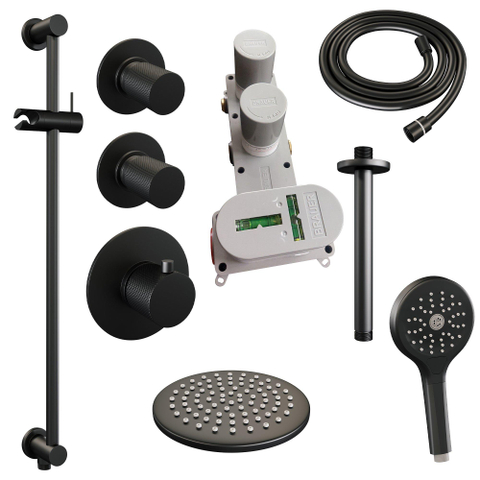 Brauer Black Carving Regendoucheset inbouw - hoofddouche 20cm - plafondarm - 3 carving knoppen - handdouche Rond 1 stand - mat zwart