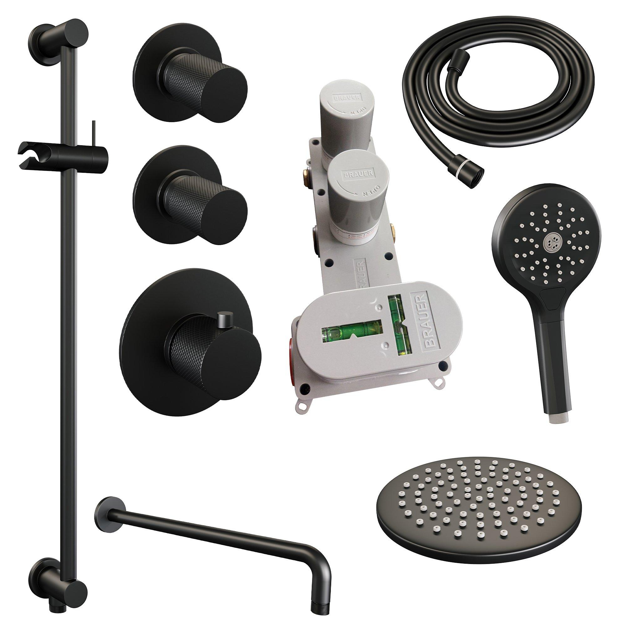 Brauer Black Carving Regendoucheset inbouw - hoofddouche 20cm - Wandarm - glijstang - met inbouwdeel - 3 Carving knoppen - handdouche Rond 1 stand - mat zwart