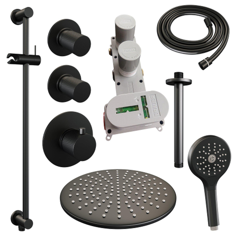 Brauer Black Carving Regendoucheset inbouw - hoofddouche 30cm - plafondarm - 3 carving knoppen - handdouche Rond 1 stand - mat zwart