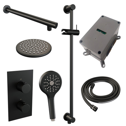 Brauer Black Carving Regendoucheset inbouw - hoofddouche 20cm - rechte wandarm - glijstang - met inbouwdeel - 2 functies - carving knop - handdouche Rond 1 stand - mat zwart SW716231