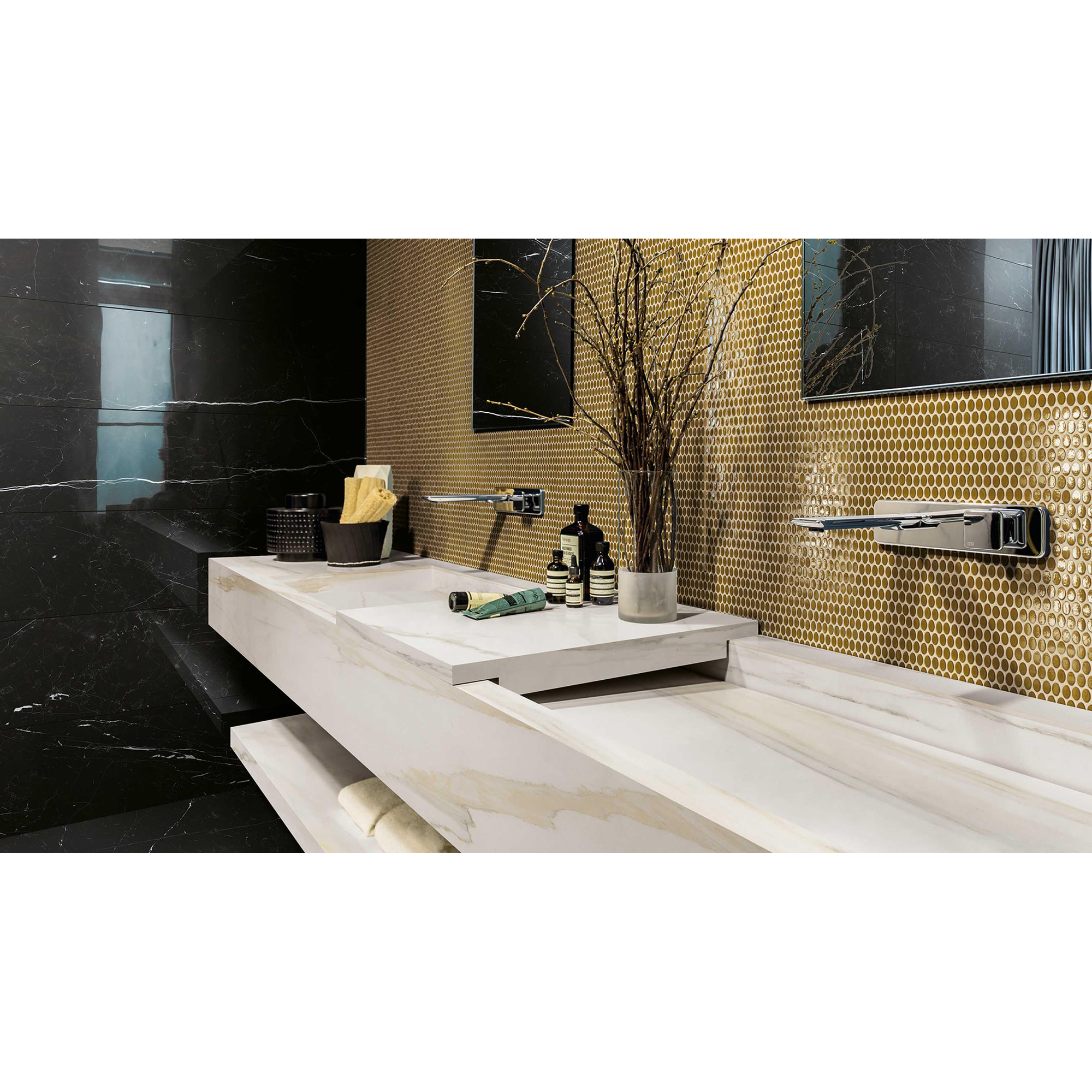Deze tegel wordt gekenmerkt door zijn stijlvolle uitstraling. Het diepe Marquinia-patroon voegt een vleugje luxe toe aan elke ruimte. Of je nu een moderne of klassieke inrichting hebt, deze tegel past perfect bij verschillende interieurstijlen. De glanzende afwerking zorgt voor een prachtige reflectie van licht, waardoor de ruimte helder en ruimtelijk aanvoelt.
