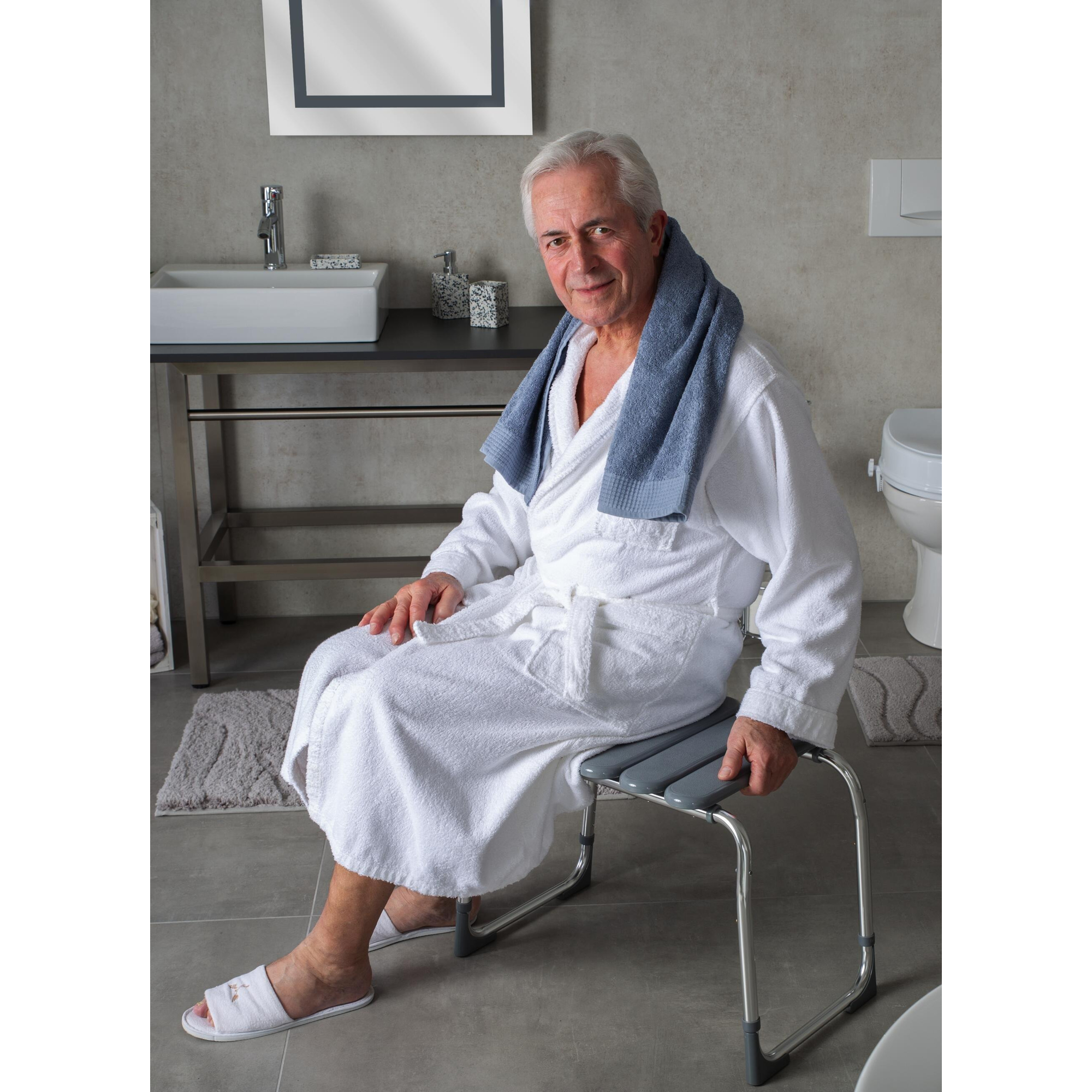 Veiligheidsinformatie: zorg ervoor dat de pootjes hoorbaar op hun plaats klikken en op dezelfde hoogte zijn voordat je de badkamerkruk gebruikt. Schommel de badkamerkruk niet en verplaats deze niet terwijl je erop zit.