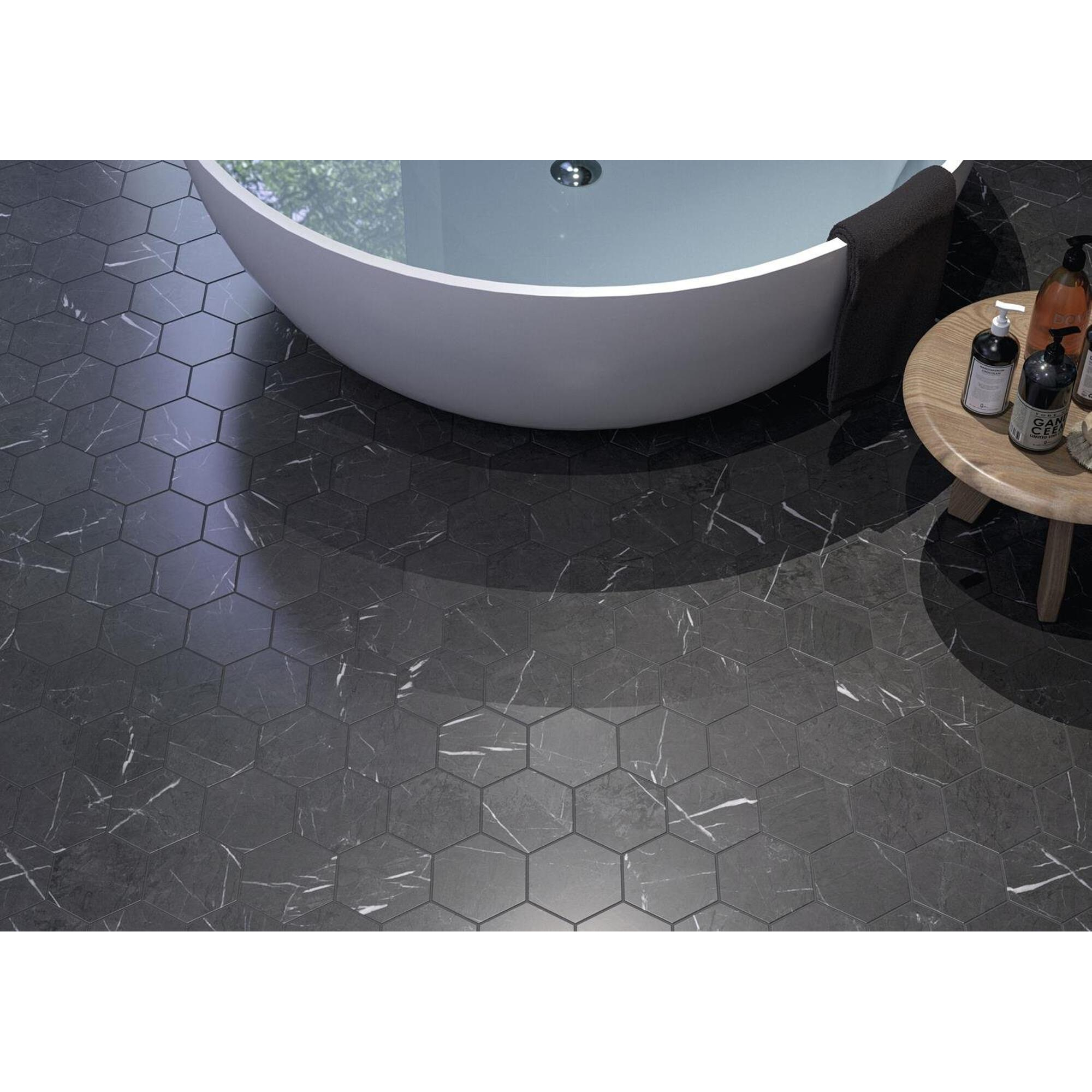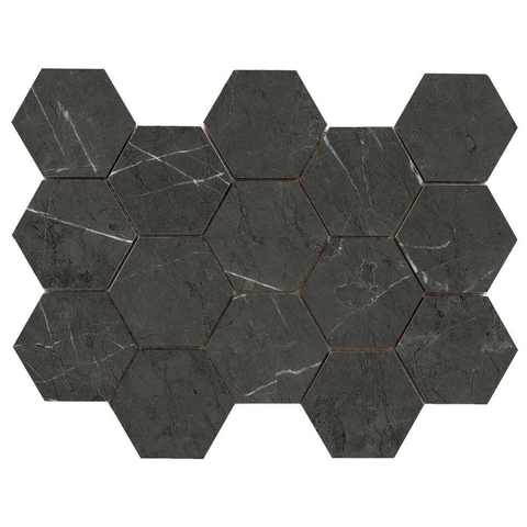 Deze Cifre Ceramica tegel straalt een tijdloze elegantie uit. Het zwart matte oppervlak in combinatie met de marmerlook geeft een luxe uitstraling aan elke ruimte. Of je nu een minimalistische of een meer weelderige inrichting hebt, deze tegel past perfect bij verschillende decoratiestijlen. Het zeshoekige ontwerp voegt een speels element toe aan de ruimte en creëert een unieke sfeer.