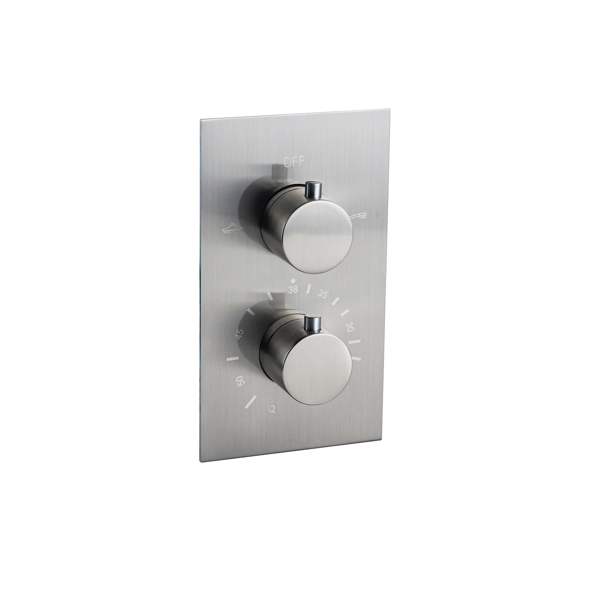 De Fortifura Calvi Thermostatische Inbouwkraan - inbouwdeel - geborsteld rvs PVD is een prachtig vormgegeven en functioneel product dat een vleugje elegantie toevoegt aan elke badkamer. Met zijn strakke lijnen en geborsteld roestvrij staal PVD-afwerking, straalt deze inbouwkraan luxe en moderniteit uit. Het thermostatische ontwerp zorgt voor een nauwkeurige controle over de watertemperatuur, waardoor je kunt genieten van een comfortabele en veilige douche-ervaring. Deze kraan is niet alleen een essentieel onderdeel van je badkamer, maar ook een stijlvolle toevoeging die de algehele uitstraling versterkt.