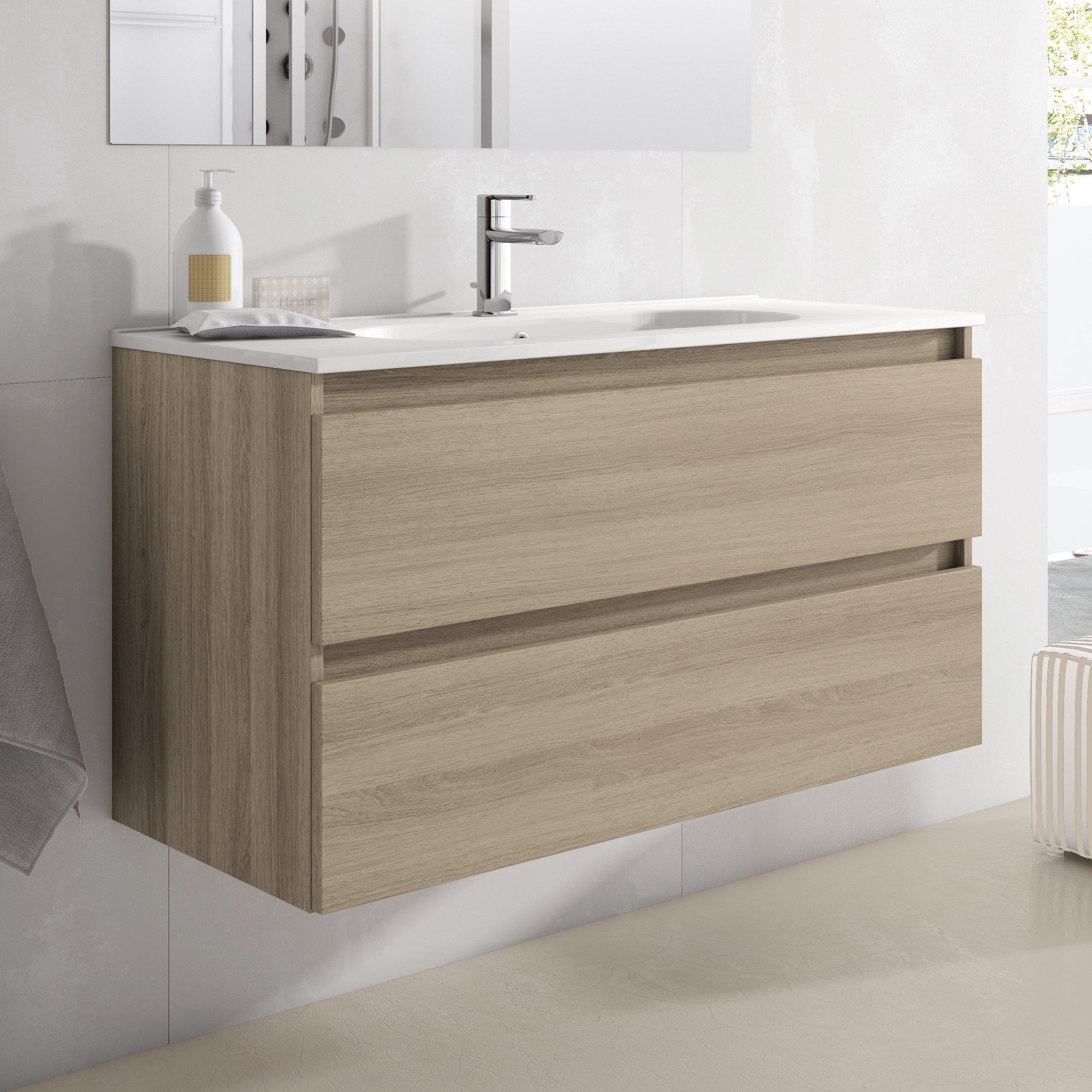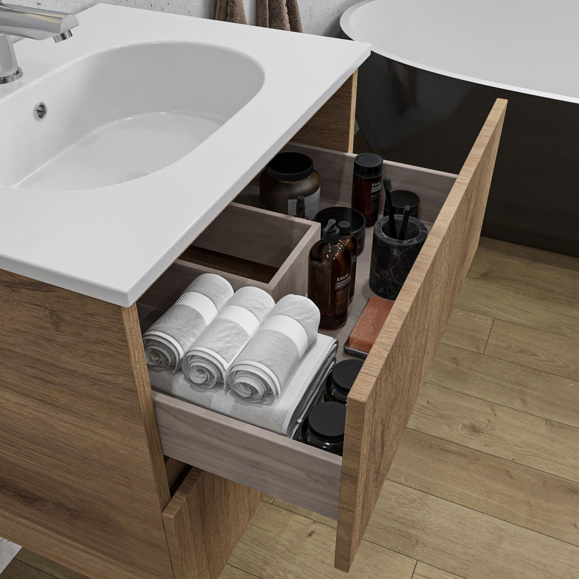 Naast zijn esthetische waarde is de Adema Chaci badkamermeubelset ook zeer functioneel. Met een ruime ovale wasbak en twee handige lades biedt dit meubel voldoende opbergruimte voor al je badkamerspullen. Het kraangat is praktisch ontworpen en maakt het eenvoudig om een kraan te installeren. De lades zijn soepel te openen en sluiten, waardoor je snel toegang hebt tot je benodigdheden.