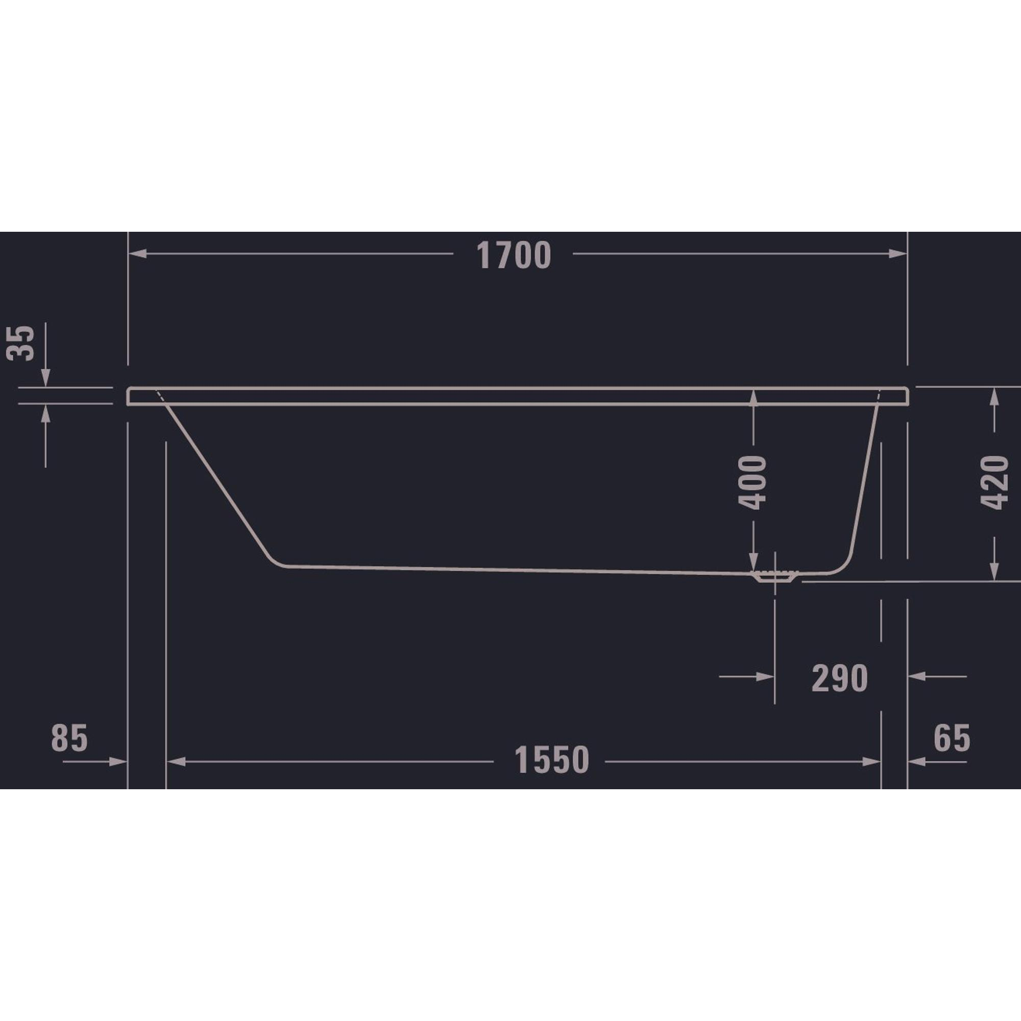 Met afmetingen van 1700 x 750 x 420 mm biedt dit bad voldoende ruimte om te ontspannen. Het heeft één schuine zijde, wat zorgt voor extra comfort tijdens het baden. De overloop voorkomt dat water over de rand stroomt, zodat je zorgeloos kunt genieten.