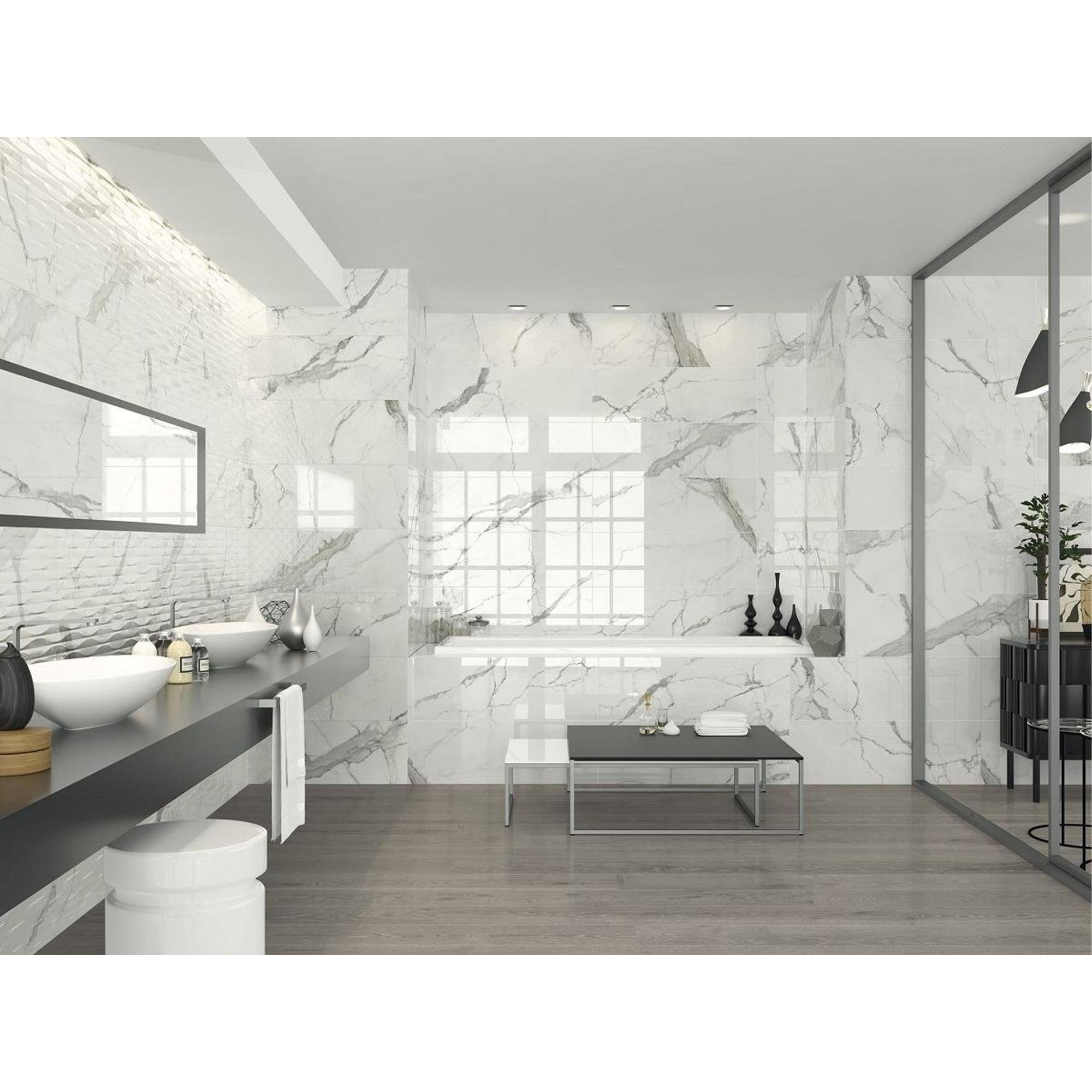 Breng de luxe van marmer in huis met de Cifre Cerámica Wandtegel Statuario. Deze prachtige wandtegel geeft direct een chique uitstraling aan elke ruimte. De tegel heeft een gerectificeerde afwerking, waardoor hij perfect strak tegen elkaar geplaatst kan worden. De marmer look van deze tegel is perfect voor wie van luxe en elegantie houdt. Door de glanzende afwerking straalt de tegel de kamer in. De kleuren wit en zwart zorgen voor een speels contrast, waardoor deze tegel perfect past bij een moderne, industriële look. Creëer een stijlvolle, tijdloze ruimte met de Cifre Cerámica Wandtegel Statuario.