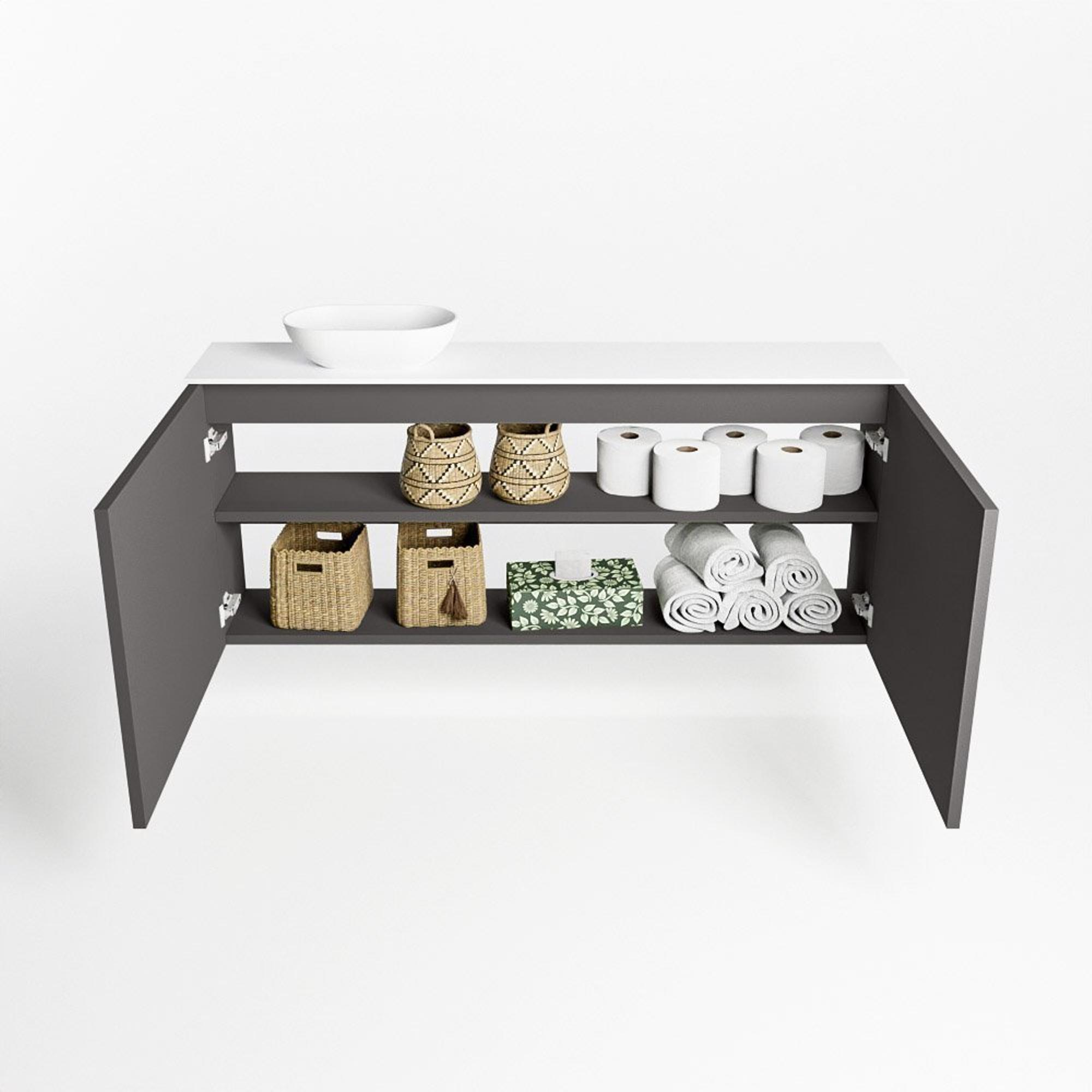 Naast zijn esthetische waarde is dit toiletmeubel ook uiterst functioneel. Met 2 deuren biedt het voldoende opbergruimte voor al jouw badkamerbenodigdheden. De wasbak aan de rechterkant zorgt voor een handige indeling, terwijl de solid surface en MDF materialen duurzaamheid garanderen. Dit meubel combineert stijl met functionaliteit op een perfecte manier.