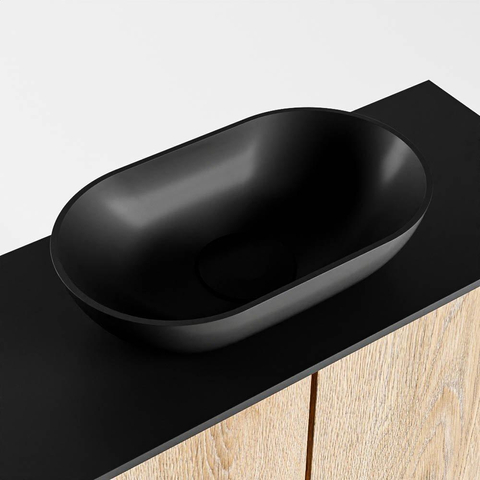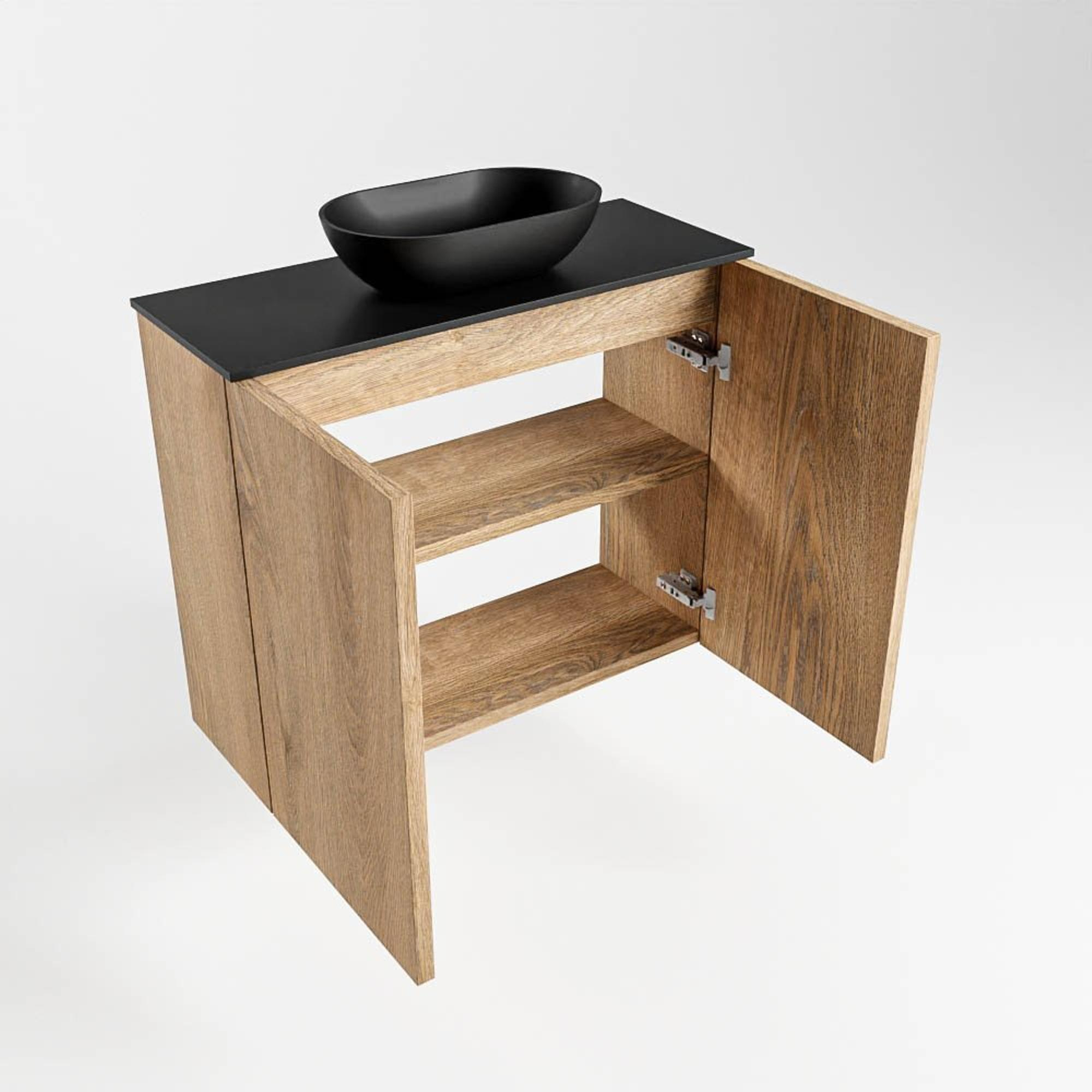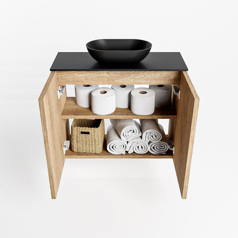 Mondiaz Fowy Toiletmeubel - 60x50x23cm - washed oak mat - 0 kraangaten - wasbak midden - 2 deuren - solid surface - blad Melamine - wasbak: zwart