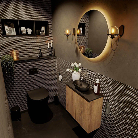 Dit toiletmeubel is niet alleen mooi, maar ook uiterst functioneel. Met 2 deuren biedt het voldoende opbergruimte voor al je badkamerbenodigdheden, waardoor je badkamer netjes en georganiseerd blijft. De zwarte wasbak voegt een vleugje elegantie toe en maakt het gemakkelijk om je handen te wassen.