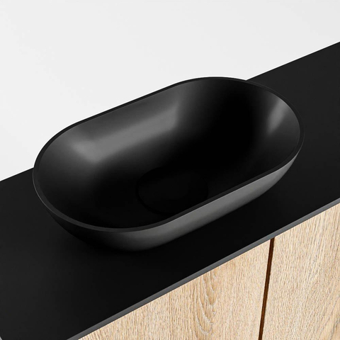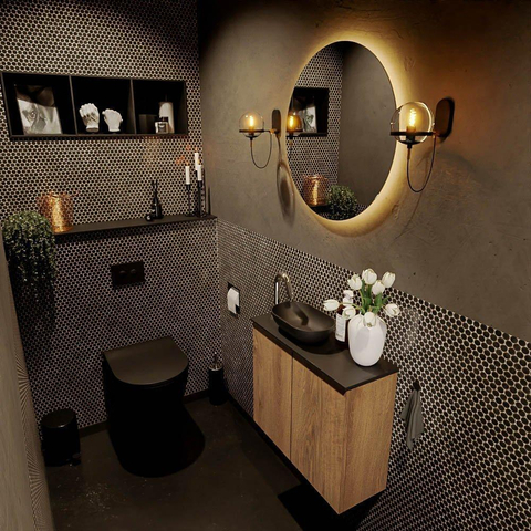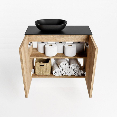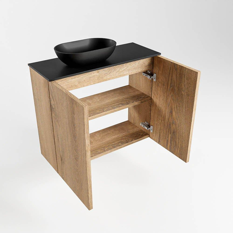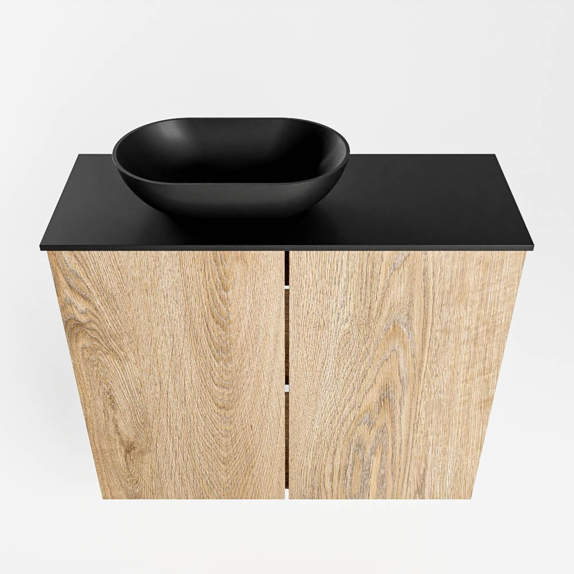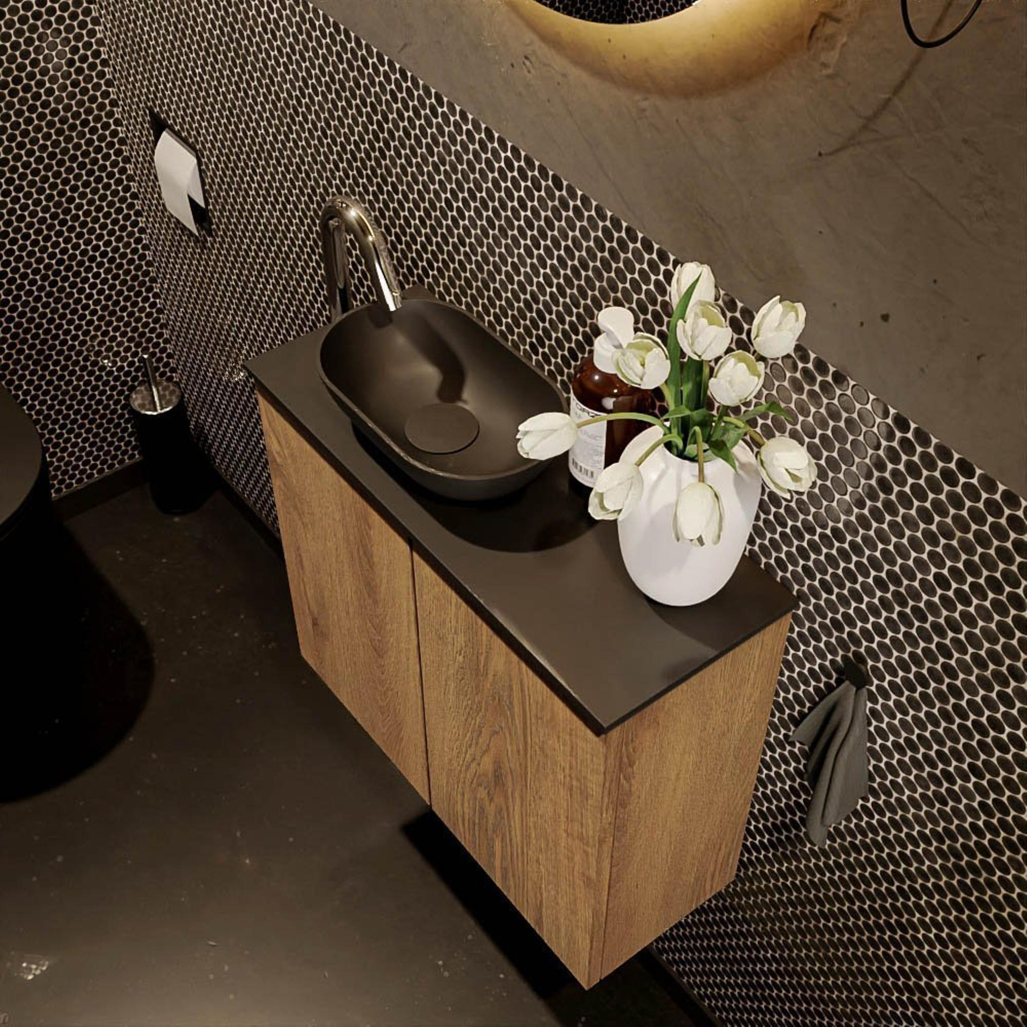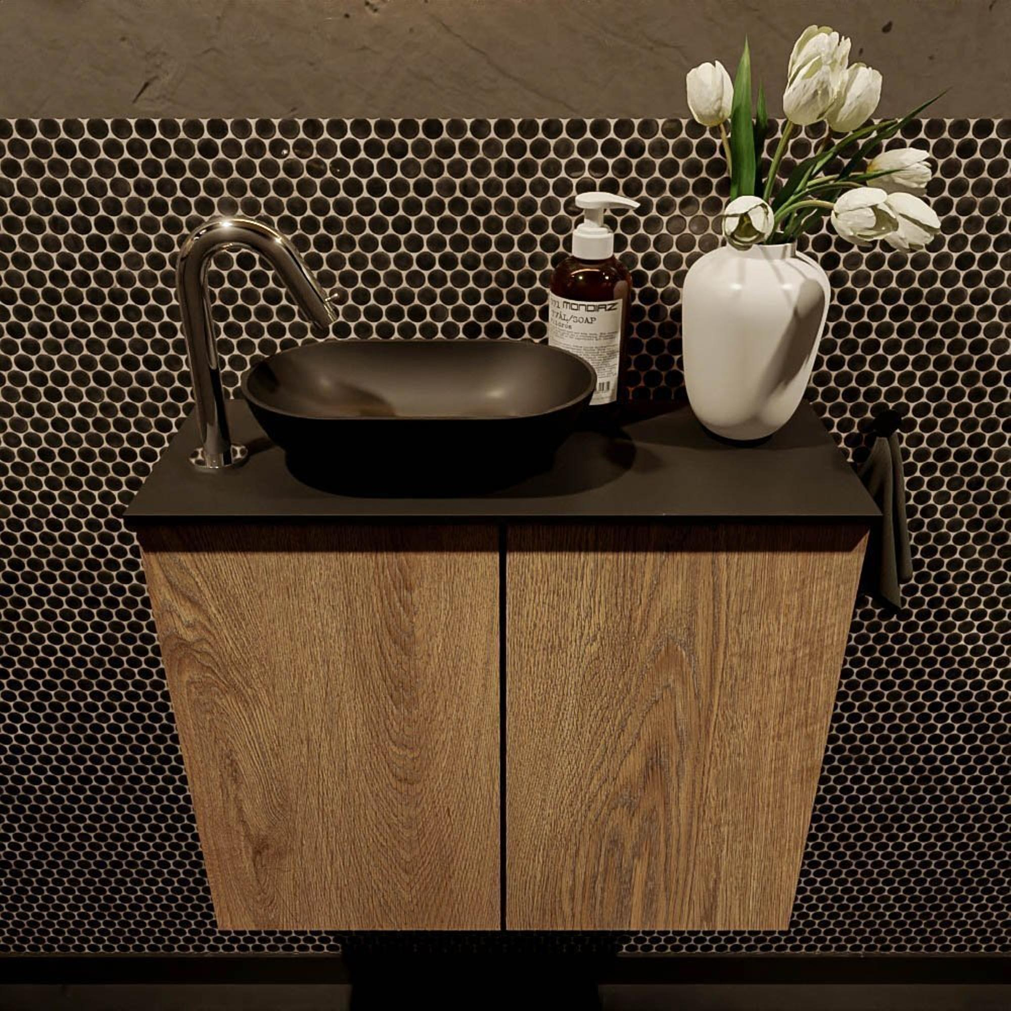 Mondiaz Fowy Toiletmeubel - 60x50x23cm - washed oak mat - 1 kraangat - wasbak links - 2 deuren - solid surface - blad Melamine - wasbak: zwart