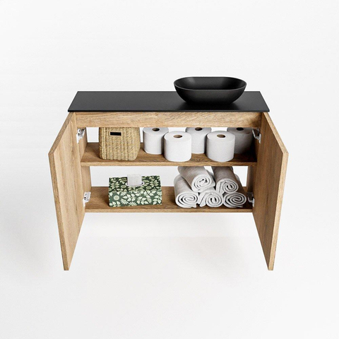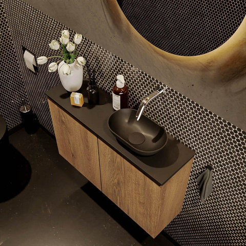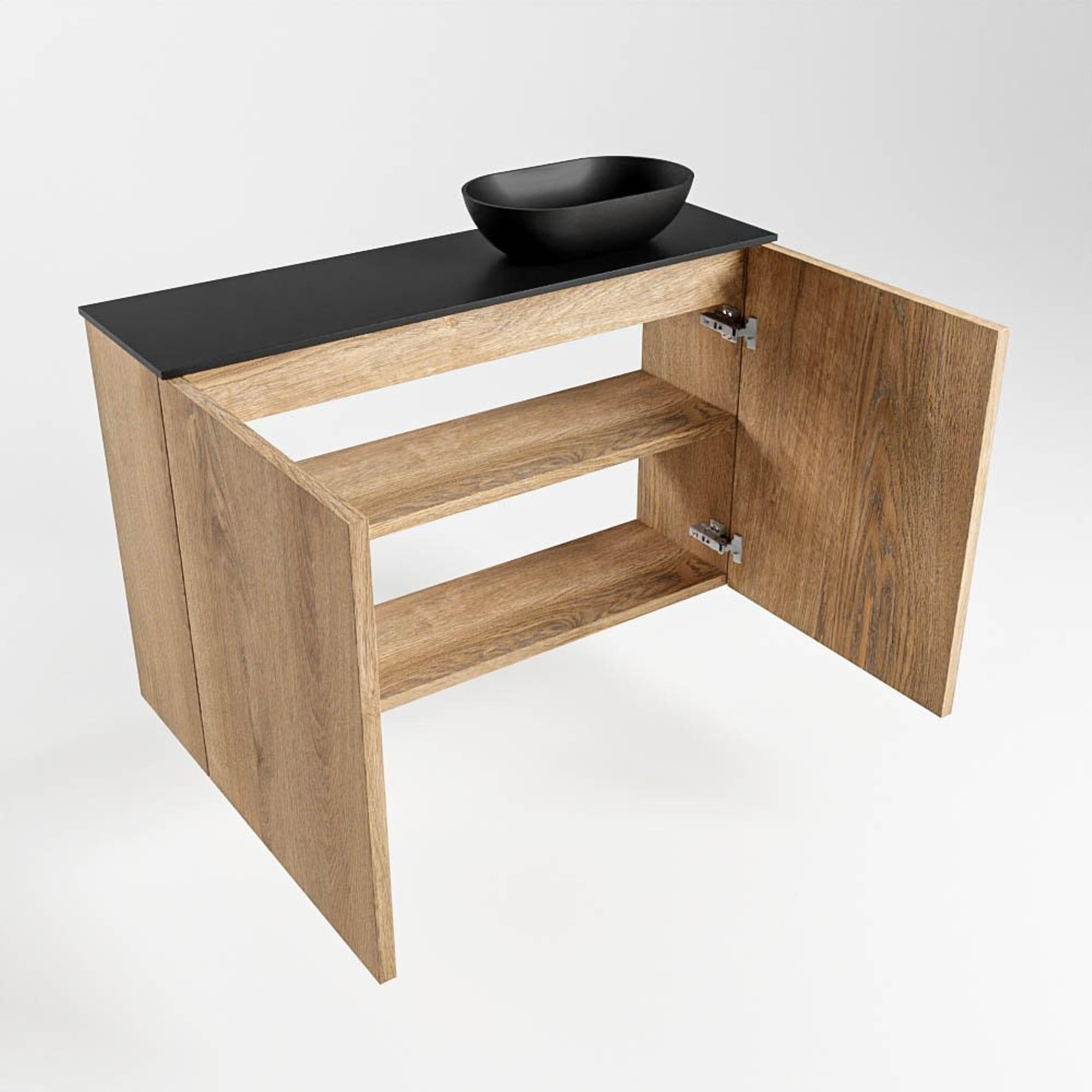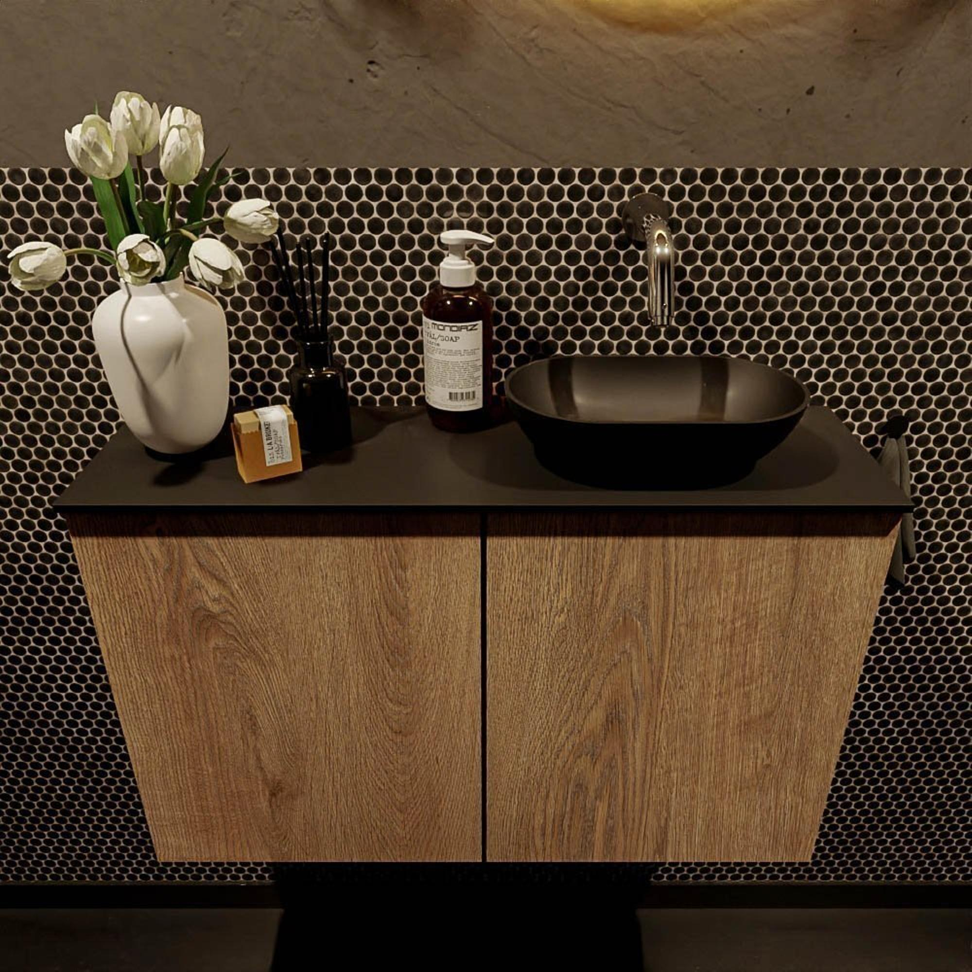 Mondiaz Fowy Toiletmeubel - 80x50x23cm - washed oak mat - 0 kraangaten - wasbak rechts - 2 deuren - solid surface - blad Melamine - wasbak: zwart