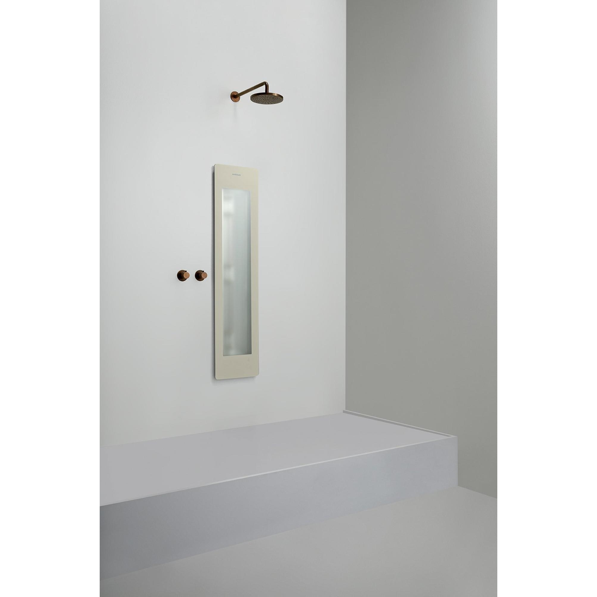 Inbouw douchepaneelDit douchepaneel van Sunshower is ontworpen om in de muur te bouwen. Hierdoor kun je de Sunshower stijlvol laten integreren in jouw douche en steekt hij niet uit. Het nadeel hiervan is wel dat de installatie een stuk lastiger is. Je moet rekening houden met een afstand van 45 cm tot het hart van de douchekop.