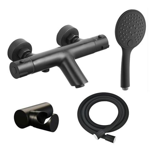 Adema Sparkle 2.0 thermostatische bad-/douchekraan met handdouchehouder, doucheslang en 3-standen handdouche mat zwart