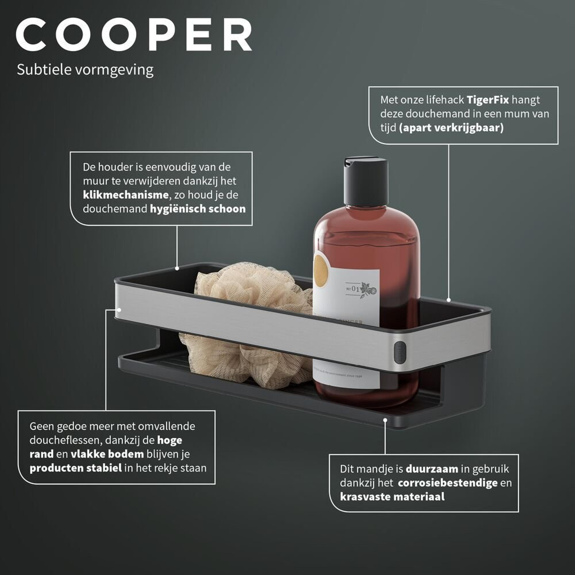 Ronde vormen, cilindervormen, ovalen, ellipsen, cirkels en eivormen. Met Cooper gaan we verder dan rond. De zachte vormgeving brengt je in balans. Zeg nu zelf, met een harmonieus interieur haal je meer positieve energie in huis. Deze douchemand van Tiger Cooper straalt rust en evenwichtigheid uit, maar dankzij het subtiele kleuraccent is hij ook een beetje spannend. Cooper is eenvoudig te bevestigen met TigerFix, onze lifehack voor iedereen die niet wil boren. Met TigerFix bevestig je onze accessoires snel en eenvoudig op een gladde, stevige ondergrond. TigerFix is apart verkrijgbaar.
