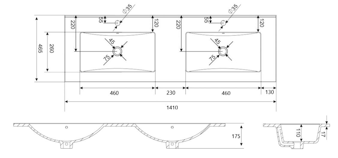 Adema Night meubelwastafel - 141x2x46cm - overloop - 2 wasbakken - 2 kraangaten - keramiek - mat zwart