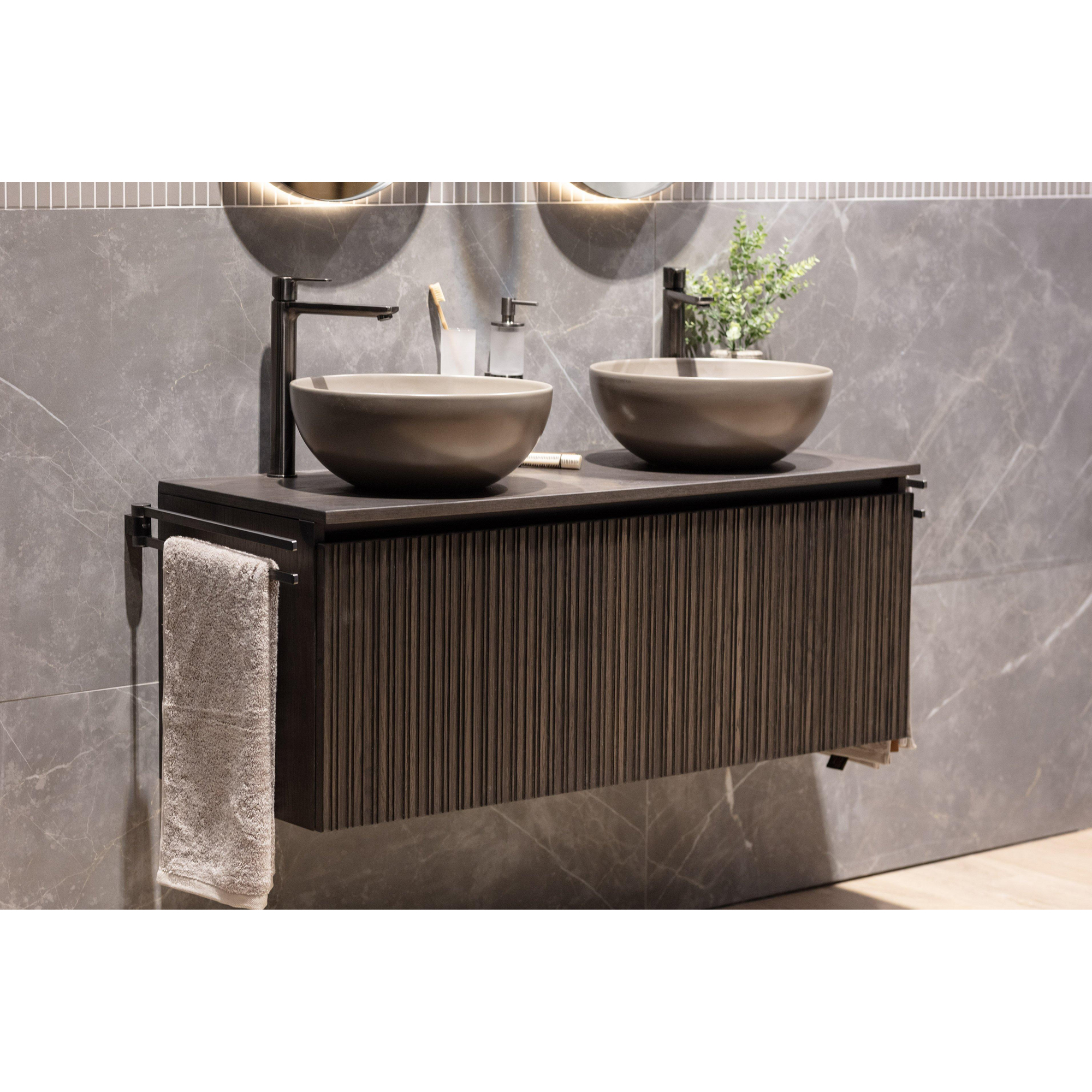 De Adema Holz Badkameronderkast straalt moderniteit uit dankzij zijn greeploze ontwerp en strakke lijnen. Het minimalistische uiterlijk past perfect bij een eigentijdse badkamerinrichting. De donker eikenkleur voegt warmte toe aan de ruimte en creëert een uitnodigende sfeer. Met zijn 120cm breedte is deze kast ideaal voor zowel kleine als grote badkamers, waardoor je opbergruimte en stijl kunt combineren op een verfijnde manier.