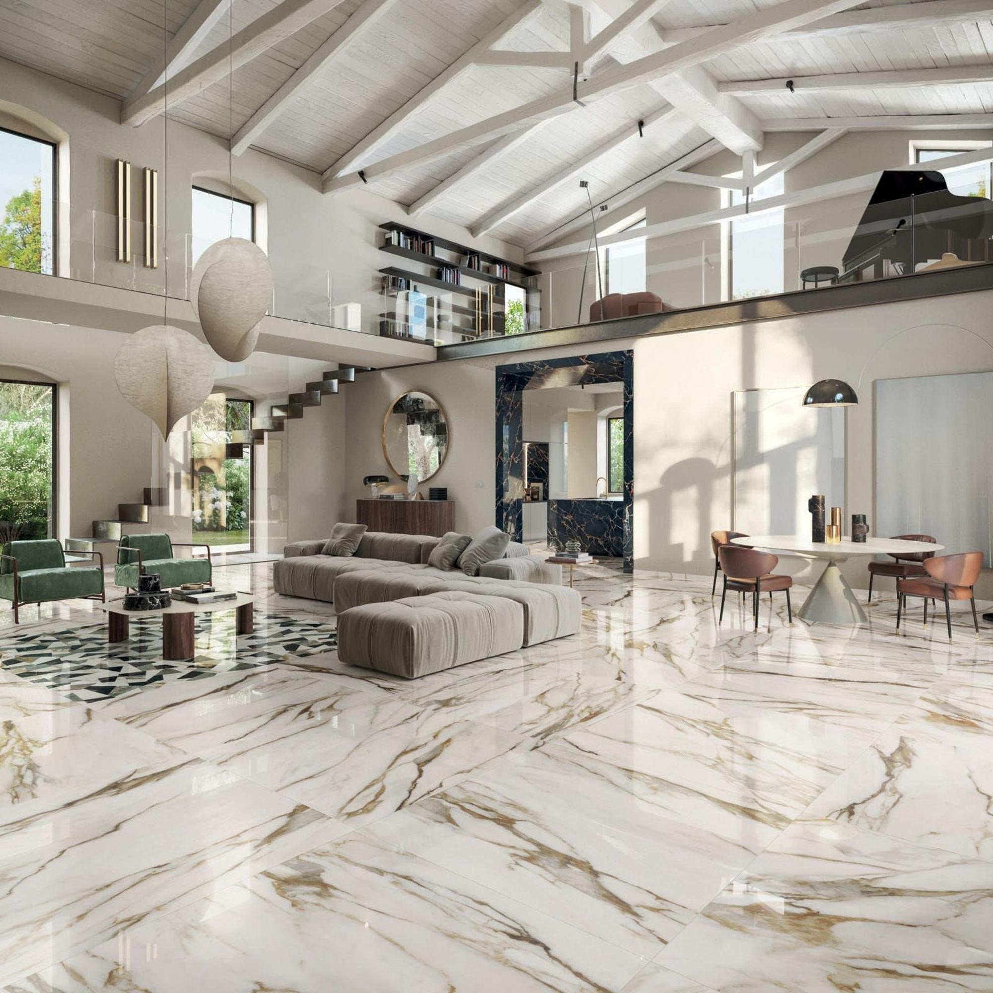 Deze tegel straalt een majestueuze uitstraling uit door zijn glanzende afwerking en gedetailleerde marmerpatroon. Het gouden en witte kleurenpalet zorgt voor een luxueuze en koninklijke ambiance in elke ruimte waarin het wordt geplaatst. De grootte van 60x119cm geeft een ruimtelijk gevoel en laat de tegel opvallen als een echt pronkstuk in de badkamer.