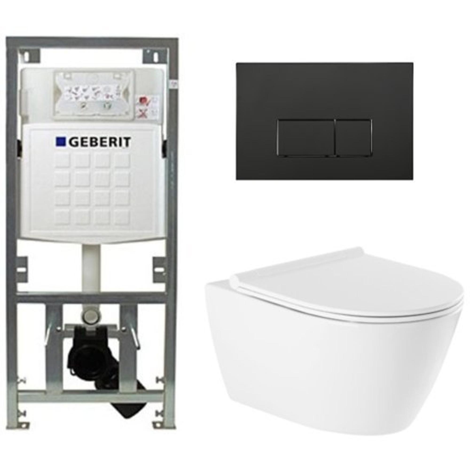 QeramiQ Salina Toiletset - rimless - Geberit inbouwreservoir - diepspoel wandcloset - softclose - quickrelease - bedieningspaneel met rechthoekige knoppen - mat zwart - wit