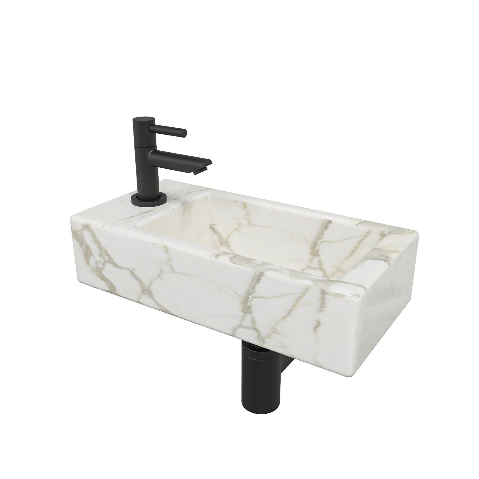 Wiesbaden Mini-Rhea Links fonteinset 36x18x9cm Carrara marmerlook wit incl. Amador fonteinkraan zwart mat