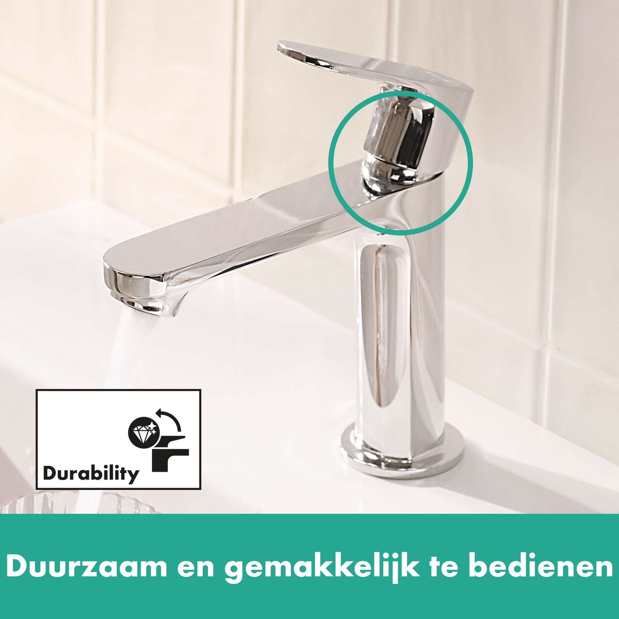 De bekende hansgrohe kwaliteit brengt beloften van een succesvol design tot leven: Een keramisch mengsysteem van hoge kwaliteit regelt de waterhoeveelheid en -temperatuur. Deze blijft soepel en betrouwbaar werken, zelfs na veelvoudig gebruik. Wil je water en energie besparen? Je merkt het bijna niet: als de greep in het midden staat, stroomt er alleen koud water. Warm of lauw water stroomt alleen als deze naar links is gezet (CoolStart). De doorstroomhoeveelheid is beperkt tot max. 5 l/min, zelfs bij hoge waterdruk (EcoSmart). De ééngreeps mengkraan verrijkt het water met lucht voor een extra volle waterstraal. Hierdoor wordt een zachte straal gecreëerd die minder sproeit - meet the beauty of water.