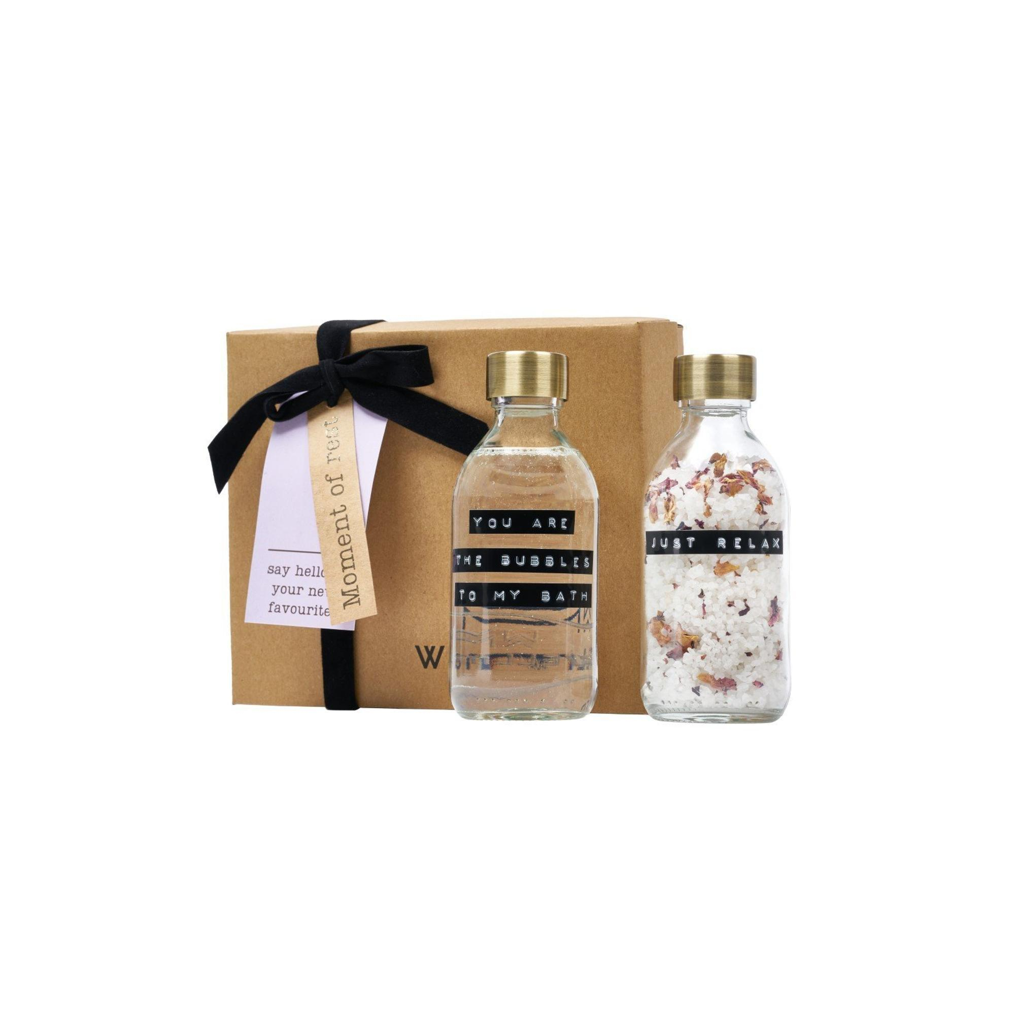Wellmark Giftbox badzout & badzeep - 2x200ml - transparant/messing - tekst: MOMENT OF REST