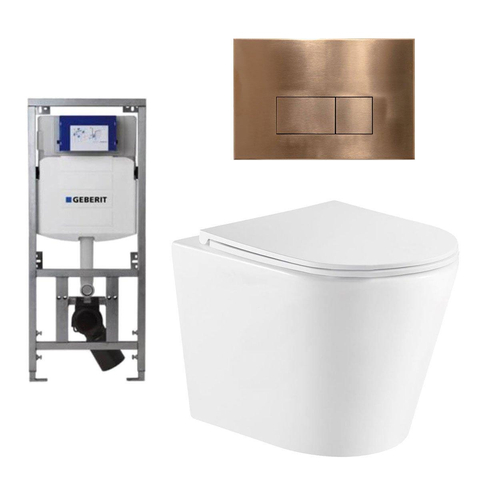 QeramiQ Dely Toiletset - 36.3x51.7cm - diepspoel - rimless - Geberit UP320 inbouwreservoir - softclose toiletzitting - koperen bedieningsplaat - rechtehoekige knoppen - wit mat