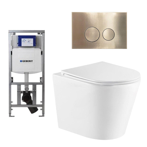 QeramiQ Dely Toiletset - 36.3x51.7cm - diepspoel - rimless - Geberit UP320 inbouwreservoir - softclose toiletzitting - geborsteld messing bedieningsplaat - ronde knoppen - wit mat