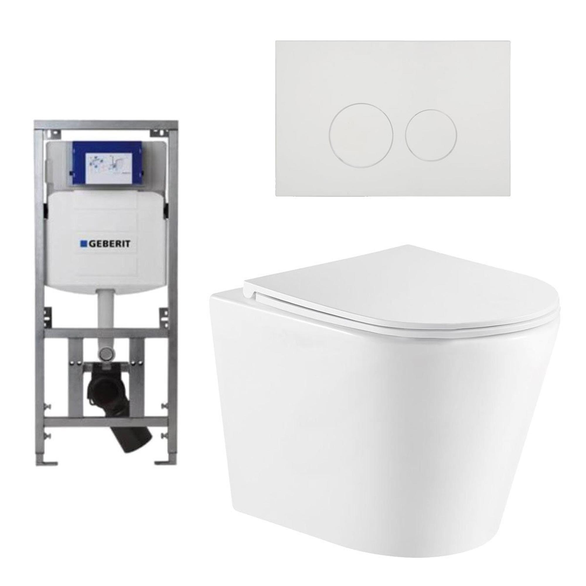 QeramiQ Dely Toiletset - 36.3x51.7cm - diepspoel - rimless - Geberit UP320 inbouwreservoir - softclose toiletzitting - glans witte bedieningsplaat - ronde knoppen - wit glans