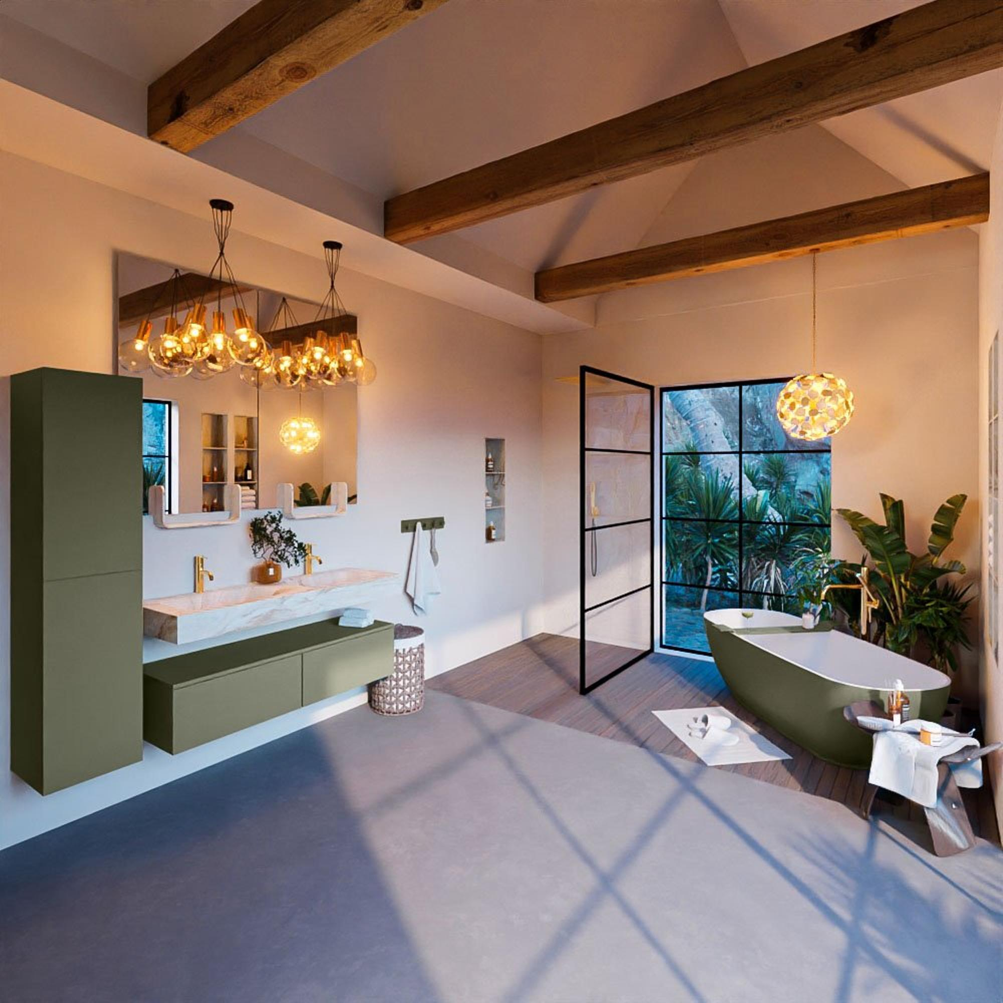 De MONDIAZ ALAN - DLUX Badkamermeubelset straalt stijl en elegantie uit. Het ontwerp in de trendy kleur Army past perfect in moderne badkamers. De vrijhangende wastafel en de dubbele wasbakken creëren een luxe uitstraling, terwijl de 2 lades zorgen voor handige opbergruimte voor al je badkamerspullen.
