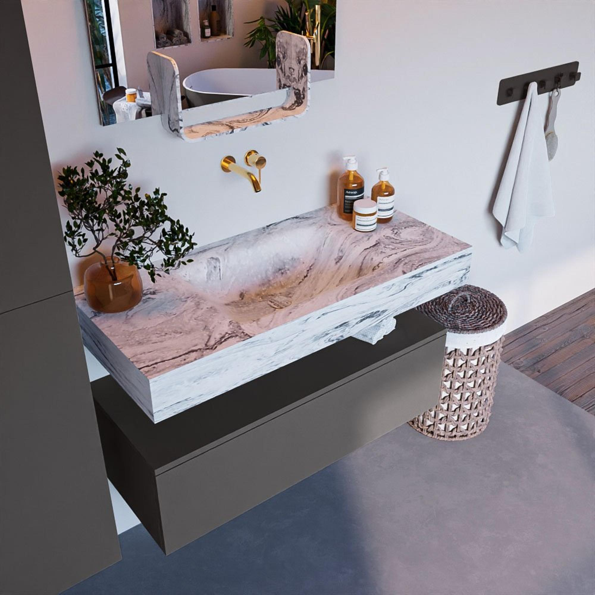Naast zijn esthetische waarde is de MONDIAZ ALAN DLUX Badkamermeubelset ook zeer functioneel. Met een breedte van 100 cm is er voldoende ruimte voor al je badkamerbenodigdheden. De vrijhangende wastafel met de wasbak in het midden zorgt voor een comfortabele en praktische gebruikservaring. De afwezigheid van kraangaten geeft je de vrijheid om je eigen kraan naar keuze toe te voegen, waardoor je badkamermeubel helemaal naar wens is.