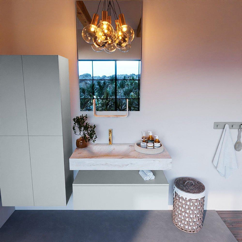 De MONDIAZ ALAN - DLUX Badkamermeubelset is ontworpen met oog voor stijl. De Clay kleur geeft een warme en moderne uitstraling aan de badkamer. De vrijhangende wastafel zorgt voor een ruimtelijk effect en de subtiele Frappe afwerking voegt een vleugje elegantie toe aan het geheel. Dit badkamermeubel is perfect voor wie op zoek is naar een tijdloos en stijlvol design.